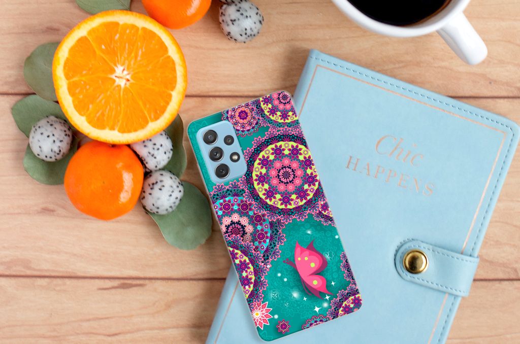 Deze opvallende Samsung Galaxy A72 Hoesje maken met Cirkels en Vlinders is een ware eyecatcher. De meeste vlinders hebben een onopvallende vleugelkleur en dat kun je van de soort op dit hoesje ook zeker wel zeggen. Wij kunnen deze opvallende vlinders en cirkels op een zeer handige tpu case zetten. Deze hoesjes zijn gewild omwille hun flexibiliteit. Met onze geavanceerde printer zetten we de print van opvallende vlinders en cirkels op de achterkant van het hoesje. De case met vlinders en cirkels blijft aan de zijkanten doorzichtig, zodat je maximaal het design van je smartphone behoudt. Verder is je telefoon natuurlijk goed beschermd met deze tpu case met print van blauwe vlinders. De bovenkant wordt bedrukt, de zijkanten niet. Met een screenprotector bescherm je ook het scherm maximaal.