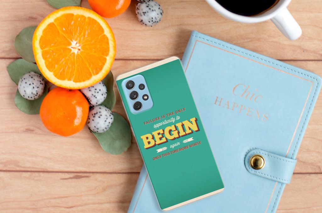 Ben je op zoek naar een uniek telefoonhoesje voor je Samsung Galaxy A72? Dan ben je bij B2C Telecom aan het juiste adres! Speciaal voor jou hebben we dit prachtige Quote Begin design in onze collectie hoesjes opgenomen. Het design wordt bedrukt op een Siliconen hoesje met naam en is gemaakt van flexibel rubber. Het design wordt alleen aan de bovenkant van het hoesje bedrukt en de randen blijven transparant. Aan de zijkanten zijn uitsparingen gemaakt waardoor je met gemak alle knoppen en poorten kunt bedienen. Wij adviseren om dit hoesje in combinatie met een screenprotector te gebruiken voor een langere levensduur van je telefoon. Wil je dit design hoesje nog iets extra's geven? Voeg dan gratis je naam of een quote toe! Is dit design hoesje toch niet helemaal wat je zocht? Ontwerp dan zelf een hoesje in ons ontwerpprogramma.
