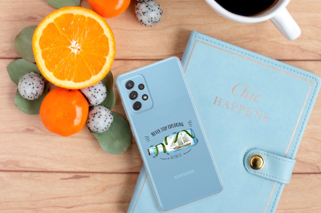 Dit leuke design met een schip in een fles is voor de echte avonturier of reiziger. Dankzij de tekst ‘Never stop exploring: Go for it’ word je altijd herinnerd aan het feit dat het volgende avontuur weer op de loer ligt! Dit design staat op een Telefoonhoesje met Naam voor je Samsung Galaxy A72. TPU is flexibel en heel erg sterk. Zo is je telefoon aan de achterkant en de randen heel goed beschermd. De case is aan de bovenkant bedrukt, de randen blijven transparant. Het TPU-hoesje is perfect te combineren met een screenprotector, zo zijn je telefoon en je beeldscherm altijd goed beschermd.