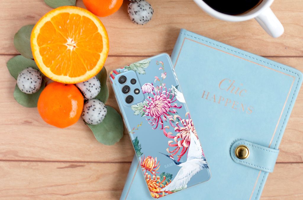 Verspreid over de hele wereld leven 19 soorten ooievaars. De spanwijdte – dat is de afstand van vleugeltip tot vleugeltip – van een volwassen ooievaar kan 2.50 meter bedragen. De gebieden waarin de ooievaar broedt, liggen in heel Europa, het Midden-Oosten, West- en Centraal-Azië en Noordwest-Afrika. Het ideale leefgebied van de ooievaar is een half open tot open landschap met veel afwisseling in grondgebruik en begroeiing. De begroeiing op dit design hoesje, in allerlei verschillende kleuren, zal niet alleen voor de ooievaars fraai zijn. Jij zult er zelf ook heel vrolijk van worden. Het in het oog springende design staat op een TPU Hoesje. Dit telefoonhoesje wordt alleen aan de bovenkant bedrukt en is zeer flexibel. De randen van het hoesje blijven transparant en worden niet bedrukt. Met dit hoesje past jouw Samsung Galaxy A72 altijd in je broekzak.
