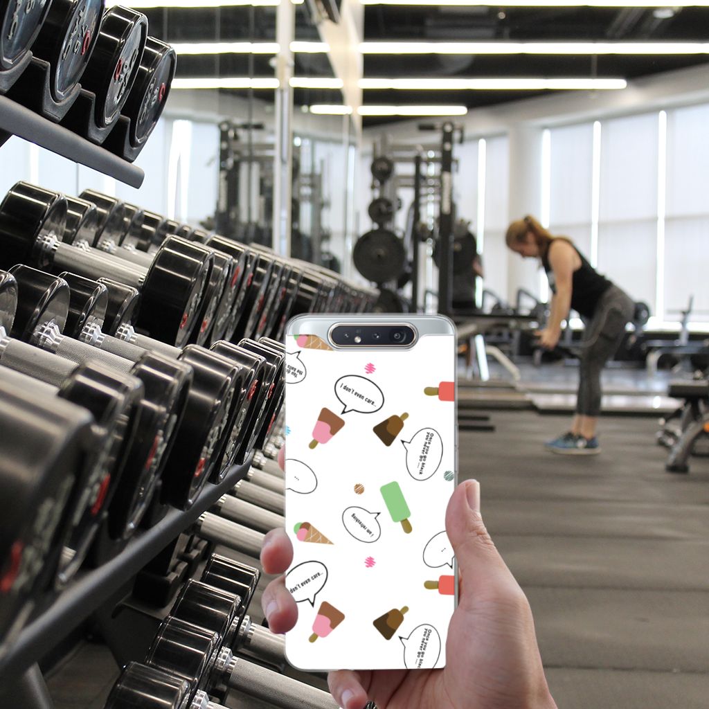 Van deze vrolijke Samsung Galaxy A80 Siliconen Case met daarop verschillende soorten ijsjes met tekstwolkjes krijg je sowieso een vrij en zomers gevoel. De zomer komt naar je toe met deze print van ijsjes met tekstwolkjes. Ben je op het strand, dan ontbreekt een lekker ijsje natuurlijk niet. Net zoals je je smartphone bij de hand hebt, met daaromheen een design hoesje met bijzondere ijsjes en tekstwolkjes. Jouw telefoon kan dan de bescherming in de vorm van een tpu hoesje met ijsjes zeer goed gebruiken. De bovenkant van dit hoesje wordt bedrukt met ijsjes en tekstwolkjes, de zijkanten blijven doorzichtig. De case is gemaakt van schokabsorberend materiaal en past altijd in je broekzak. Onder alle weersomstandigheden zal deze TPU case perfect functioneren, ook in de zomer met een ijsje in je hand.