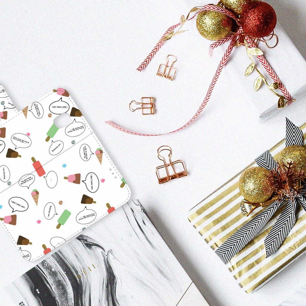 Van dit vrolijke Samsung Galaxy J5 2017 Book Cover met daarop verschillende soorten ijsjes met tekstwolkjes krijg je sowieso een vrij en zomers gevoel. De zomer komt naar je toe met deze print van ijsjes met tekstwolkjes. Ben je op het strand, dan ontbreekt een lekker ijsje natuurlijk niet. Net zoals je je smartphone bij de hand hebt, met daaromheen een design hoesje met bijzondere ijsjes en tekstwolkjes. Jouw telefoon kan dan de bescherming in de vorm van een boekhoesje met ijsjes zeer goed gebruiken. Alle zijden van dit hoesje worden bedrukt met ijsjes en tekstwolkjes. De case heeft een lipje aan de buitenzijde voor het afsluiten van de telefoon en de houder aan de binnenzijde is van TPU. Onder alle weersomstandigheden zal deze case met verschillende opbergvakjes perfect functioneren, ook op het strand met een ijsje in je hand.