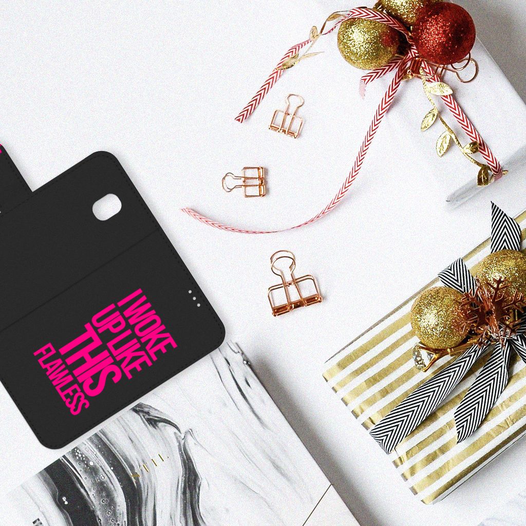 Met dit zwarte Samsung Galaxy J5 2017 Hoesje met naam met paarse tekst heb je een geweldige bescherming van je smartphone in handen. Dit zwarte hoesje met Woke Up tekst is een must voor jouw smartphone. Met dit design hoesje tekst val je ook zeker op. Je weet ook zeker dat het hoesje exclusief is. Het design is gemaakt door B2C Telecom. Het hoesje heeft verschillende vakjes en is aan alle zijden bedrukt. Ook het lipje aan de buitenkant kan worden bedrukt. De houder is van TPU, de buitenzijde van PU-leer. We willen je er ook op wijzen dat je zelf een hoesje kunt ontwerpen, met eigen beelden en teksten. Met onze Phone Case Designer kun je zelfs opvallende effecten, patronen en clip arts aan het ontwerp toevoegen.