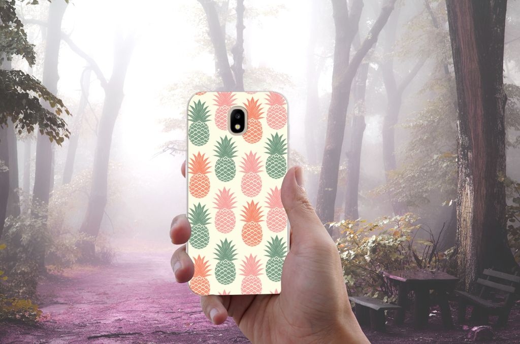 Ananas is een woord uit het Tupi, de taal van de Tupi-indianen, en betekent uitmuntende vrucht. Dit fruit van zeer hoge kwaliteit staat op onze superieure boekhoesjes, stand cases, hard cases en TPU cases. Jij blijft er gezond uitzien als je zo nu en dan een hap neemt van een Ananas , jouw smartphone blijft tip top in orde als je er een leuk telefoonhoesje omheen doet. Een ananas heeft stevig, veerkrachtig vruchtvlees. Een beetje te vergelijken met het TPU in onze hoesjes. TPU is elastisch materiaal, dat zeer buigzaam is. Vandaar dat het zeer schokbestendig is. Het ananas design staat op een staat op een TPU case. Deze Samsung Galaxy J5 2017 Siliconen Case wordt alleen aan de bovenkant bedrukt en is zeer flexibel. De randen van het hoesje blijven transparant.