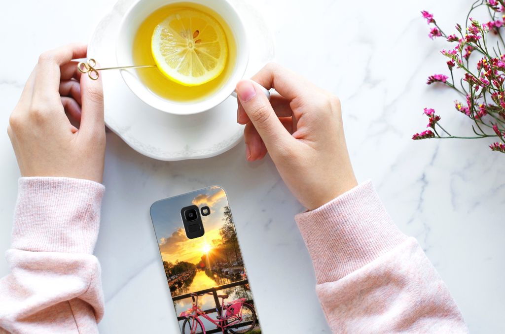 Amsterdam is meer dan ooit een toeristische trekpleister. Een bezoek aan de hoofdstad is niet compleet als je niet aanlegt bij de Amsterdamse Grachten. Ze zijn een symbool van de stad en hebben een enorme culturele en historische waarde. Daarom kunnen ze natuurlijk niet ontbreken in onze collectie design hoesjes. Dit schitterende design hoesje met Amsterdamse grachten tref je enkel en alleen aan bij B2C Telecom. De ondergaande zon en de fleurige en fraaie bloempakketten zorgen voor een prachtig totaalplaatje. Amsterdam is wereldberoemd om haar prachtige grachten uit de zeventiende eeuw. Dit smartphone hoesje is hier een eerbetoon aan. Het design staat op een TPU case. Dit Samsung Galaxy J6 2018 Siliconen Back Cover wordt alleen aan de bovenkant bedrukt en is zeer flexibel. De randen van het hoesje blijven transparant.