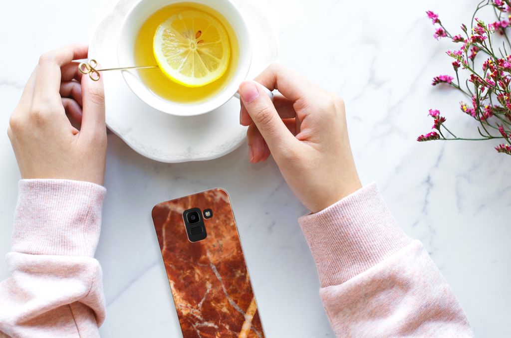 Dit design hoesje met Marmer Bruin is voor de artistieke personen onder ons. De Grieken en Romeinen wisten het al te waarderen door het als bouw- en bekledingsmateriaal toe te passen. Naast het witte Carrara marmer met haar zacht grijze geaderde belijning zijn de diverse soorten in een ruim kleurenpallet te krijgen. We hebben verschillende kleuren op design hoesjes gezet, zoals in dit geval bruin marmer. Dit is een Samsung Galaxy J6 2018 TPU Siliconen Hoesje met marmer in bruine kleur. Het marmer wordt bedrukt op de voorkant van een tpu case, die beschikt over opstaande randen aan de voorkant en heel goed combineert met een screenprotector. De rijkheid aan kleuren en varianties in afwerking geeft ontwerpers de vrijheid om met marmer hele mooie architectonische projecten te realiseren. Wij hebben onze designer ook veel vrijheid gegeven. Het resultaat zie je terug in deze tpu case met bruin marmer, die jouw smartphone goed beschermt. De zijkanten van de case worden niet bedrukt met marmer.