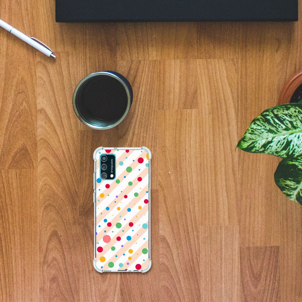 Ben je op zoek naar een uniek telefoonhoesje voor je Samsung Galaxy M02s | A02s? Dan ben je bij B2C Telecom aan het juiste adres! Speciaal voor jou hebben we dit prachtige Dots design in onze collectie hoesjes opgenomen. Het design wordt bedrukt op een Doorzichtige Silicone Hoesje en is gemaakt van flexibel rubber. Het hoesje is perfect voor de actieve smartphonegebruiker door de opstaande randen/hoeken. Denk aan mensen die veel sporten, reizen of wandelen en net iets meer zekerheid willen als het op hun geliefde telefoon aankomt. Het design wordt alleen aan de bovenkant van het hoesje bedrukt en de randen blijven transparant. Aan de zijkanten zijn uitsparingen gemaakt waardoor je met gemak alle knoppen en poorten kunt bedienen. Wij adviseren om dit hoesje in combinatie met een screenprotector te gebruiken voor een langere levensduur van je telefoon. Wil je dit hoesje nog iets extra's geven? Voeg dan gratis je naam of een quote toe! Is dit design hoesje toch niet helemaal wat je zocht? Ontwerp dan zelf een hoesje in ons ontwerpprogramma.