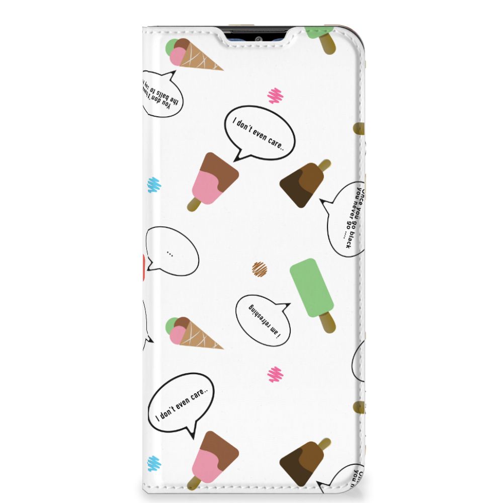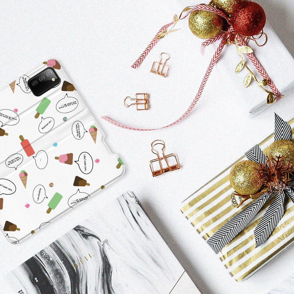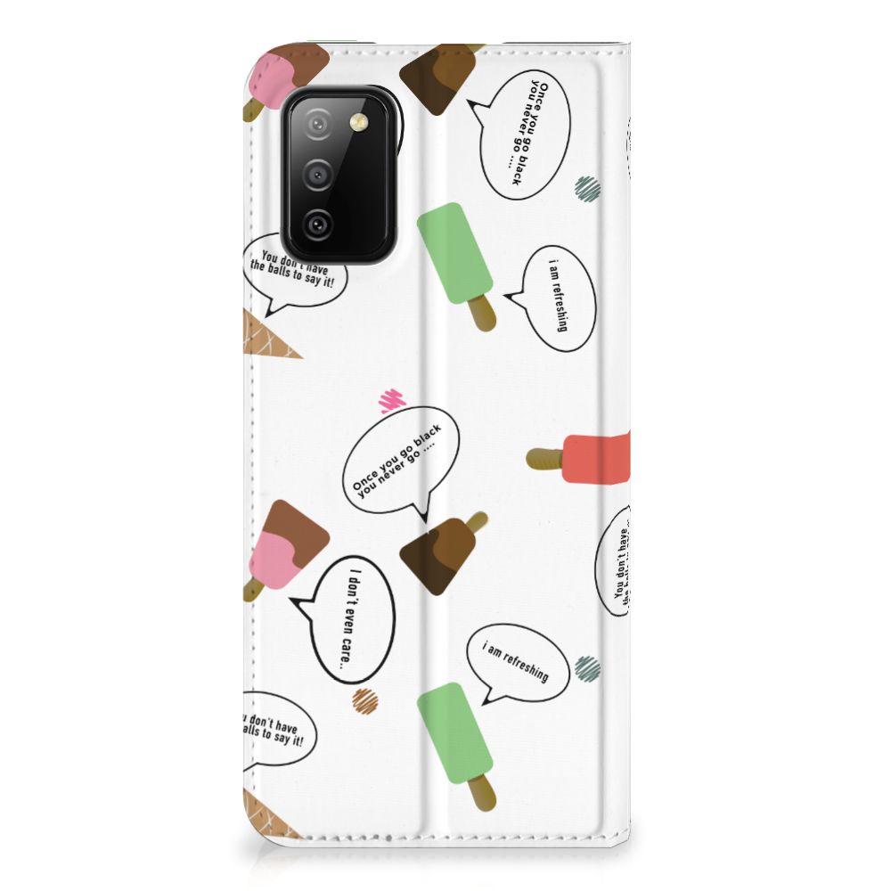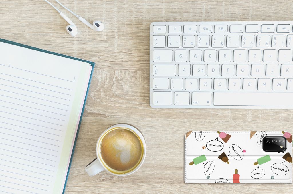 Van deze vrolijke Samsung Galaxy M02s | A02s Flip Style Cover met daarop verschillende soorten ijsjes met tekstwolkjes krijg je sowieso een vrij en zomers gevoel. De zomer komt naar je toe met deze print van ijsjes met tekstwolkjes. Ben je op het strand, dan ontbreekt een lekker ijsje natuurlijk niet. Net zoals je je smartphone bij de hand hebt, met daaromheen een design hoesje met bijzondere ijsjes en tekstwolkjes. Jouw telefoon kan dan de bescherming in de vorm van een stand case met ijsjes zeer goed gebruiken. Alle zijden van dit hoesje worden bedrukt met ijsjes en dankzij de speciale standaard is het erg prettig om filmpjes te bekijken. De case wordt aan de binnenzijde met een magneet afgesloten en de houder aan de binnenzijde is van TPU. Onder alle weersomstandigheden zal deze case met 1 opbergvakje en ijsjes perfect functioneren, ook op het strand met een ijsje in je hand.