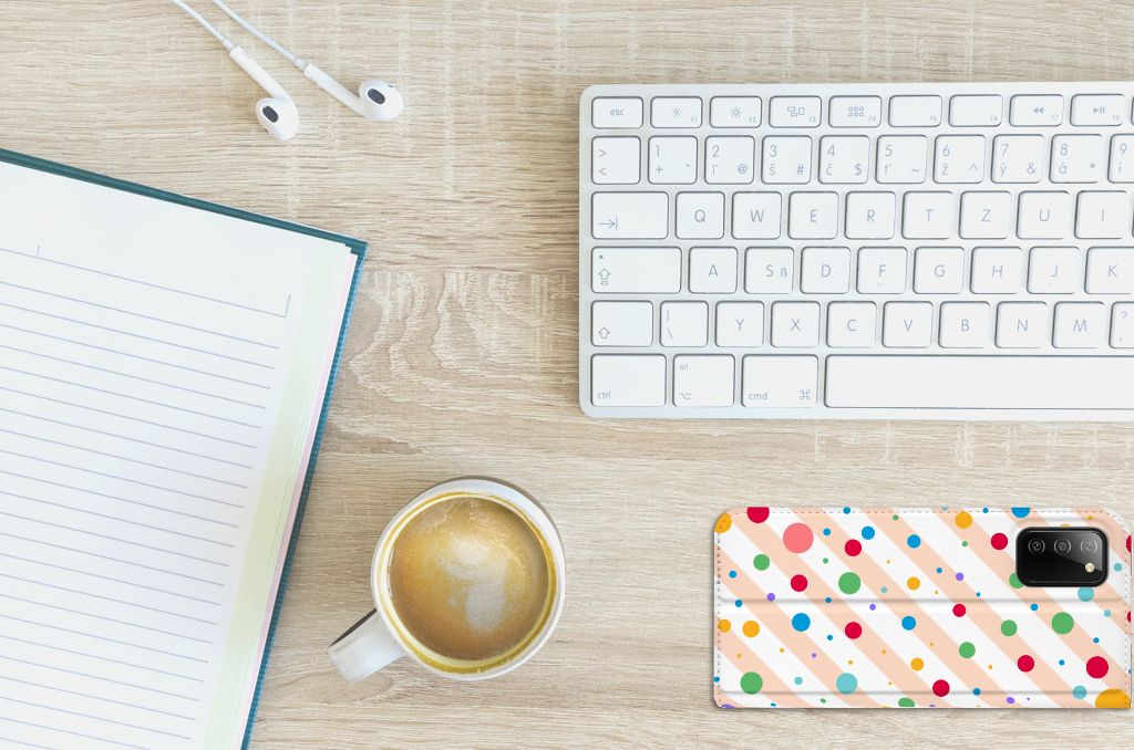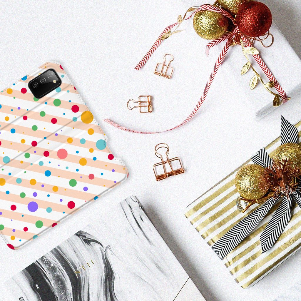 Een Samsung Galaxy M02s | A02s Hoesje met Magneet met verschillende kleuren stippen is een schitterende bescherming van jouw smartphone. De stand case met het design Dots in alle kleuren van de regenboog komt voor jou als geroepen. Maak je geen gebruik van dit zeer mooie hoesje, dan kan het met jouw smartphone een beetje beroerd aflopen. Dit mooie stand hoesje met verschillende kleuren stippen zorgt voor een volledige bescherming van je smartphone en wordt aan alle zijden bedrukt. Dankzij de speciale standaard kun je rustig achteroverleunend filmpjes bekijken terwijl je je handen vrij hebt. Verder is de houder aan de binnenzijde van TPU. Jouw telefoon is dus zeer goed opgeborgen en kan geen kant op. Met een hoesje met stippen in verschillende kleuren op alle zijden blijft jouw telefoon volledig in tact. Heb je liever een stand case met stippen in andere opvallende kleuren? Ontwerp dan zelf case met je eigen foto’s en teksten!
