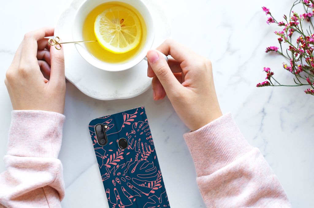 Je voelt je verbonden met de natuur als je kiest voor deze Samsung Galaxy M11 | A11 Smart Cover met print van roze bladeren op een blauwe achtergrond. De print bestaat uit verschillende roze bladeren en dit zorgt voor een fraai decoratief geheel. Met dit patroon van roze bladeren op een blauwe achtergrond creëer je een opvallende uitstraling voor jouw smartphone. Jij doet er verstandig aan om je telefoon te beschermen met dit design hoesje met roze bladeren op een blauwe achtergrond, die staan op een stand case. Dit hoesje kenmerkt zich onder meer door het handige vakje aan de binnenzijde en de magnetische sluiting aan de binnenzijde. Voel jij jezelf happy bij een beeld van roze bladeren op een blauwe achtergrond, dan is deze stand case met print een uitstekende optie. Het beschermt jouw telefoon aan alle zijden. Het TPU aan de binnenzijde klemt zich perfect om jouw smartphone.