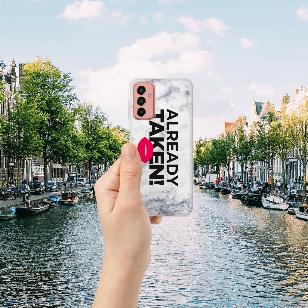 Stel dat je opdringende vrouwen of mannen van je af wil schudden op het moment dat je aan het feesten bent, omdat je al een partner hebt. Dan kun je dat met dit hoesje uitstekend duidelijk maken. Je Samsung Galaxy M13 | M23 neem je waarschijnlijk vaak ter hand, dus dan zal de boodschap als je over dit hoesje beschikt zeker weten overkomen. Ook in het openbaar vervoer zal dit hoesje ervoor zorgen dat je minder snel versierd wordt door het andere geslacht. Als je vrijgezel bent en op zoek naar gezelschap, dan kun je beter kiezen voor een ander hoesje uit ons ruime en gevarieerde assortiment. Het design Already Taken White staat op een Siliconen hoesje met naam. Dit hoesje wordt alleen aan de bovenkant bedrukt en is zeer flexibel. De randen van het hoesje blijven transparant.