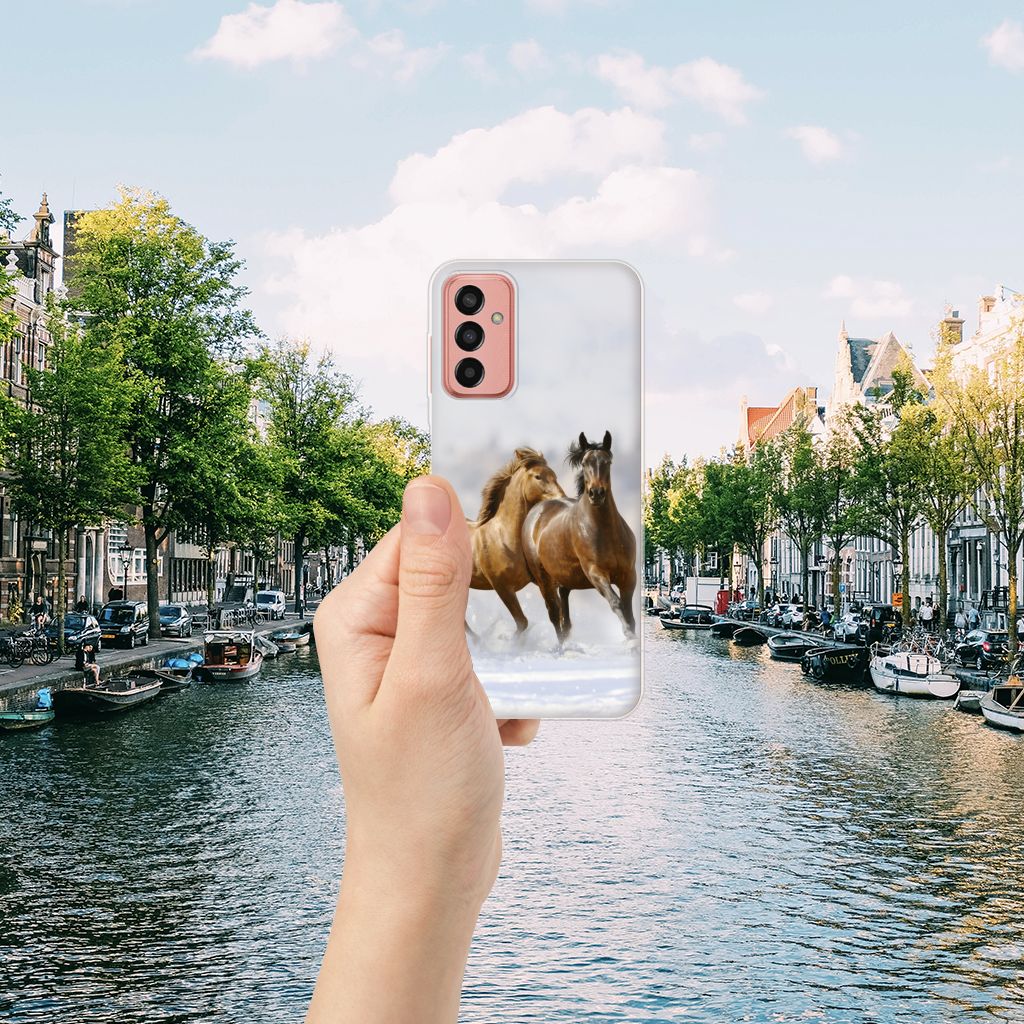 Voor de paardenliefhebbers onder ons hebben we onze collectie uitgebreid met dit design hoesje met print van paarden. Vroeger hield de mens vooral werkpaarden, inmiddels hebben we vriendschap gesloten met het paard. Vandaar dat het ook een favoriet dier is op onze smartphonehoesjes, zoals deze tpu case. Een TPU Hoesje voor de Samsung Galaxy M13 | M23 met Paarden is niet alleen super mooi en chique, maar ook nog eens zeer flexibel. Verder is de case schokabsorberend en heeft het opstaande randen. Zie je liever je eigen paard terug op een hoesje. Dat kan! Door zelf een uniek hoesje te ontwerpen, met eigen foto’s en teksten. De TPU case wordt aan de bovenzijde bedrukt, de zijkanten blijven transparant.
