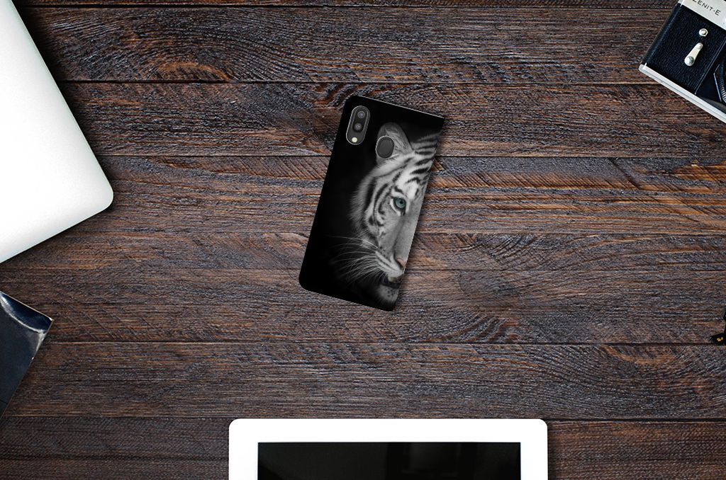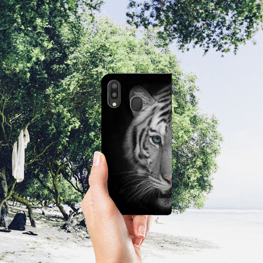 Omdat de Witte Tijger zo bijzonder is, zijn wij bereid deze voor zeer lage kosten op een stand case te zetten. Dit kunnen we zo goedkoop doen omdat we het drukwerk in eigen beheer doen. Witte tijgers leefden lange tijd in de bossen van India, Bangladesh, Nepal, Bhutan en China en kunnen wel 257 kilo wegen. Dit zwaargewicht kunnen we bedrukken op verschillende soorten hoesjes, zoals deze stand cases. Het Samsung Galaxy M20 Hoesje maken is van PU-leer (buitenzijde) en TPU (binnenzijde) en beschikt over een houder voor pasjes en briefgeld. Verder is dit hoesje met witte tijger print voorzien van magneten aan de binnenzijde. Tegenwoordig zijn witte tijgers alleen in gevangenschap te bewonderen. Jij zorgt voor de perfecte bescherming van je smartphone met dit design hoesje met witte tijger.