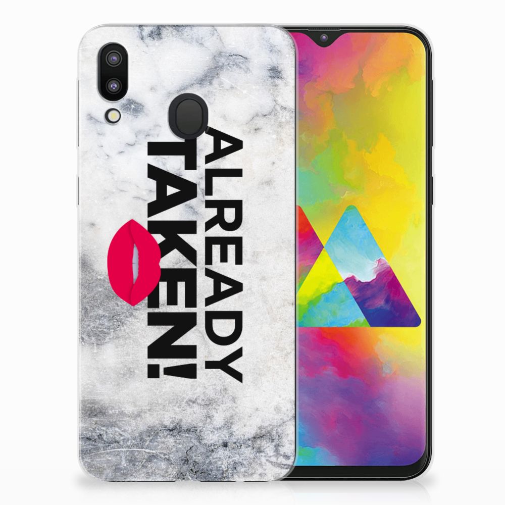 Stel dat je opdringende vrouwen of mannen van je af wil schudden op het moment dat je aan het feesten bent, omdat je al een partner hebt. Dan kun je dat met dit hoesje uitstekend duidelijk maken. Je Samsung Galaxy M20 (Power) neem je waarschijnlijk vaak ter hand, dus dan zal de boodschap als je over dit hoesje beschikt zeker weten overkomen. Ook in het openbaar vervoer zal dit hoesje ervoor zorgen dat je minder snel versierd wordt door het andere geslacht. Als je vrijgezel bent en op zoek naar gezelschap, dan kun je beter kiezen voor een ander hoesje uit ons ruime en gevarieerde assortiment. Het design Already Taken White staat op een Siliconen hoesje met naam. Dit hoesje wordt alleen aan de bovenkant bedrukt en is zeer flexibel. De randen van het hoesje blijven transparant.