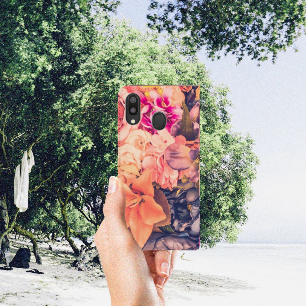 Dit Bosje Bloemen doet een mens en zijn smartphone goed. De oranje, paarse en roze bloemen op deze Samsung Galaxy M20 Smart Cover geven jouw smartphone een zeer sierlijke uitstraling. Je wordt er ook meteen vrolijker van als je aan het appen, mailen of aan het bellen bent. Valt dan je telefoon op de grond, dan zal er dankzij de stand case met oranje, paarse en roze bloemen geen schade ontstaan. Onze stand cases met oranje, paarse en roze bloemen bieden de allerbeste bescherming en zijn heel praktisch, wat blijkt uit onder meer het vakje aan de binnenkant en de handige standaard waarmee je de smartphone rechtop op tafel neer kunt zetten. De oranje, paarse en roze bloemen passen goed op alle zijden van de case. Op deze stand case van leer en TPU (houder aan de binnenkant) is het ook mogelijk je eigen ontwerp te zetten. In no time maak je zelf een stand case met daarop foto’s van jouw favoriete bloemen.