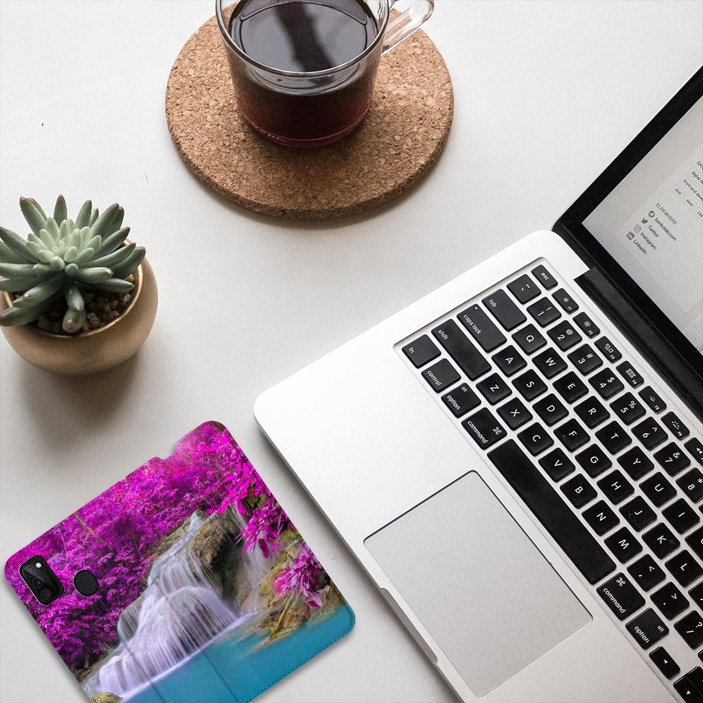 Van een waterval kun je een heel rustig gevoel krijgen, zeker als die op een Samsung Galaxy M30s | M21 Book Cover staat dat jouw smartphone perfect beschermt tegen allerlei vormen van schade zoals krassen, barsten en scheuren. In de buurt van een waterval ben je tijdens warme zomerdagen niet alleen verzekerd van aangename verkoeling, het is ook een bijzonder rustgevende ervaring. Uit onderzoek blijkt zelfs dat watervallen een helend effect hebben op allerlei aandoeningen. Extra bijzonderheid aan de stand case vormen de paarse bossen op de achtergrond. Dit smartphonehoesje beschermt jouw telefoon aan alle zijden en beschikt over een opbergvakje voor pasjes en briefgeld. De case sluit perfect af dankzij de magneten van binnen. De houder aan de binnenzijde is van TPU. Alle zijden van het hoesje worden bedrukt. Een mooiere waterval met paarse achtergrond kom je op geen enkel ander hoesje tegen.