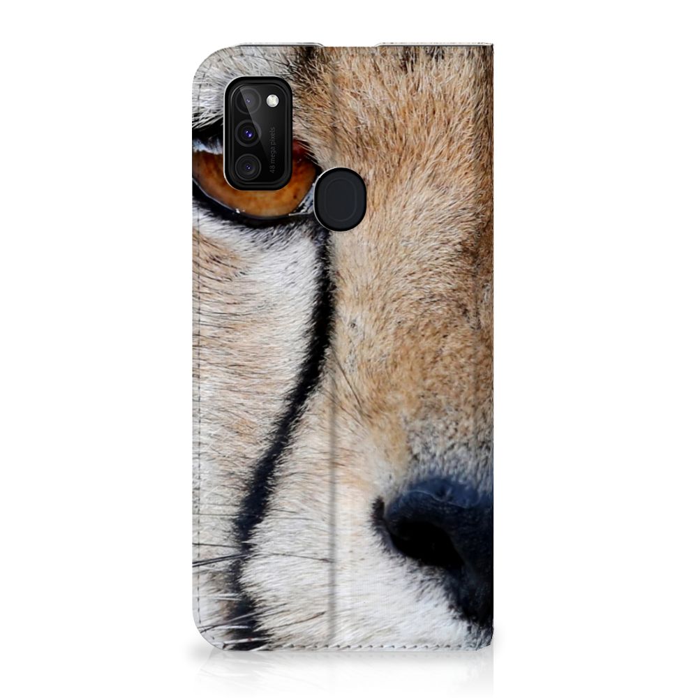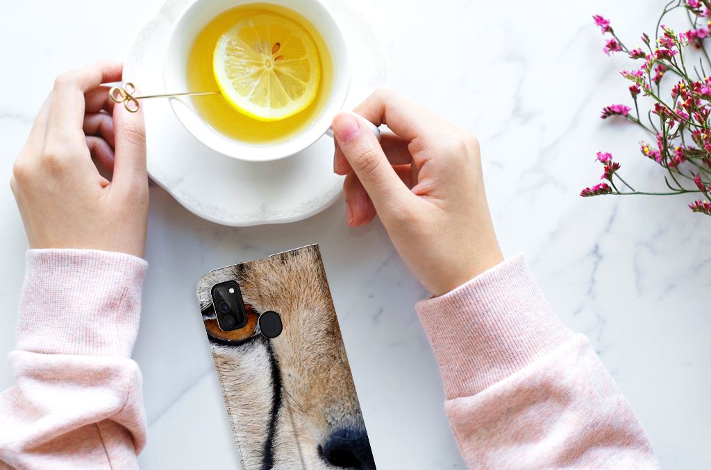 Wist je dat een cheetah, ook wel jachtluipaard genoemd, een topsnelheid van 120 km/u kan halen? Dit maakt de cheetah tot het snelste landdier ter wereld. Dit design hoesje met cheetah print kunnen we dus met recht zeer flitsend noemen. Dit komt niet alleen door de foto van het jachtluipaard, maar ook door de uitstraling van het hoesje. De close up van het dier hebben we op een stand case gezet. Dit is een multifunctionele case, met een vakje aan de binnenzijde waarin je een pasje kwijt kunt. Hiermee is de kous nog niet af, want een Samsung Galaxy M30s | M21 Hoesje maken wordt aan de binnenzijde magnetisch afgesloten en heeft een standaard. De vacht van jachtluipaarden is bedekt met ronde, zwarte vlekjes. Hierdoor valt het dier in zijn natuurlijke leefomgeving zo min mogelijk op. Jij doet dat zeker wel, met deze stand case met design. De buitenzijde is van leer, de houder aan de binnenzijde van TPU.