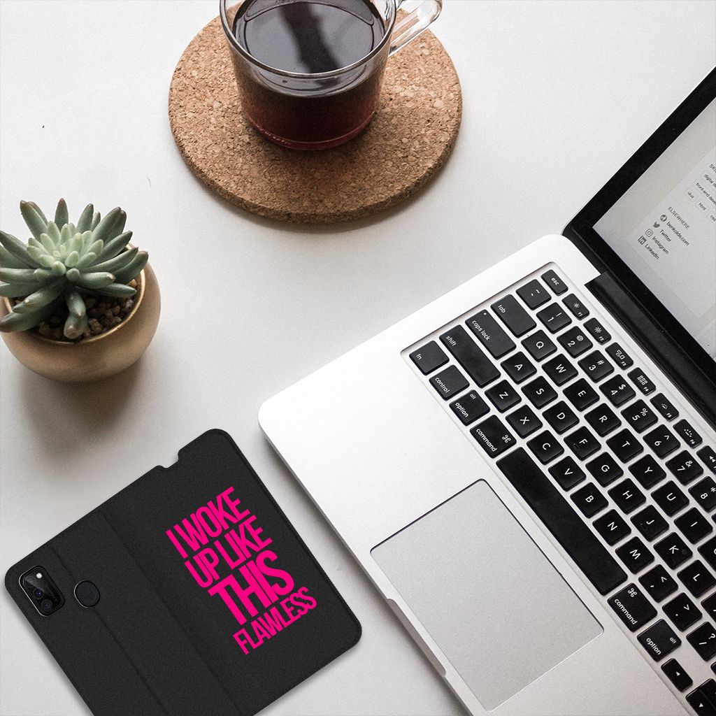 Met deze zwarte Samsung Galaxy M30s | M21 Hoesje met tekst met deze paarse tekst kun je met recht trots zijn. De case komt als geroepen voor jouw smartphone. Met dit zwarte design hoesje met Woke Up tekst heb je een zeer solide product in handen. Dit zeer populaire smartphone hoesje heeft 1 vakje en is aan alle zijden bedrukt. Verder heeft de case een standaard en een magneet aan de binnenkant. De houder is van TPU, de buitenzijde van PU-leer. We willen je er ook op wijzen dat je zelf een hoesje kunt ontwerpen, met eigen beelden en teksten. Met onze Phone Case Designer kun je zelfs opvallende effecten, patronen en clip arts aan het ontwerp toevoegen.