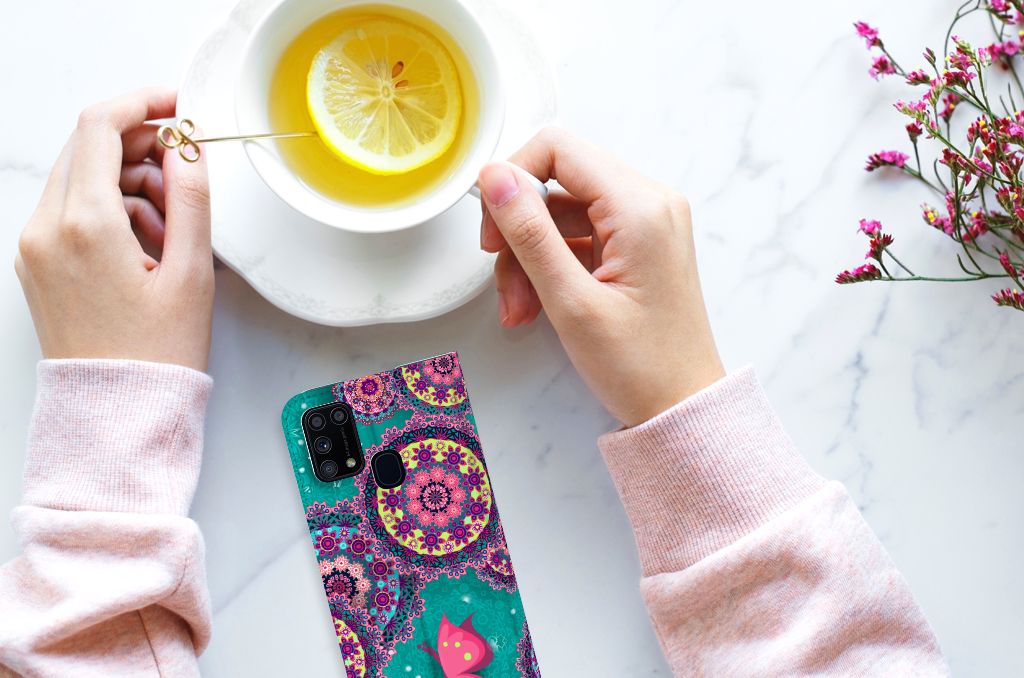 Deze opvallende Samsung Galaxy M31 Bookcase met Cirkels en Vlinders is een ware eyecatcher. De meeste vlinders hebben een onopvallende vleugelkleur en dat kun je van de soort op dit hoesje ook zeker wel zeggen. Wij kunnen deze opvallende vlinders en cirkels op een zeer handige stand case zetten. Deze hoesjes zijn zeer gewild. Met onze geavanceerde printer zetten we de print van opvallende vlinders en cirkels op alle zijden van het hoesje. De case met vlinders heeft aan de binnenkant een houder waarin je jouw creditcard of ander pasje kwijt kunt. De case heeft bovendien een handige standaard. Verder is je telefoon natuurlijk maximaal beschermd met deze stand case met print van opvallende en kleurrijke vlinders. De houder aan de binnenzijde van het design hoesje met opvallende vlinder print is van TPU.