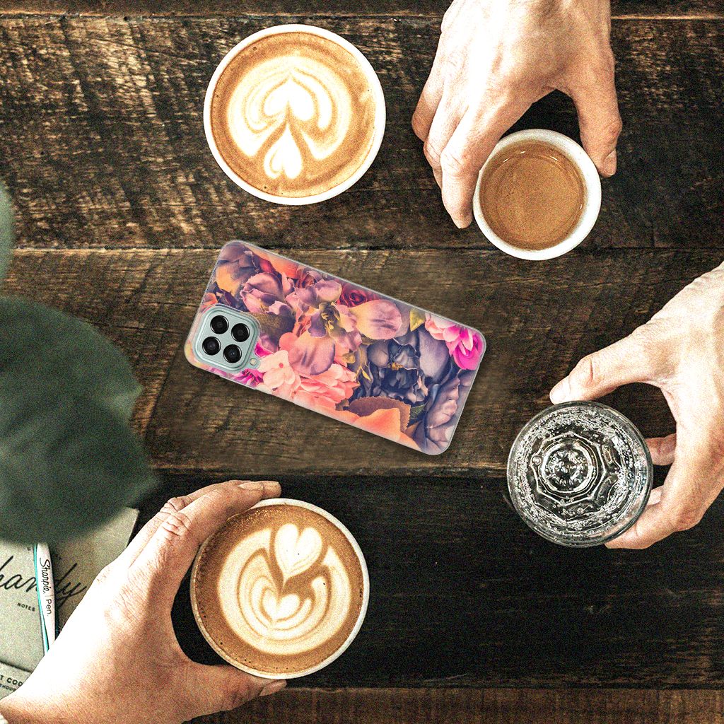 Dit Bosje Bloemen doet een mens en zijn smartphone goed. De oranje, paarse en roze bloemen op deze Samsung Galaxy M33 TPU Case geven jouw smartphone een zeer sierlijke uitstraling. Je wordt er ook meteen vrolijker van als je aan het appen, mailen of aan het bellen bent. Valt dan je telefoon op de grond, dan zal er dankzij de tpu case met oranje, paarse en roze bloemen geen schade ontstaan. Helemaal niet als je er een screenprotector bij hebt gekocht. Onze tpu cases met oranje, paarse en roze bloemen zien er zeer prettig uit en zijn heel praktisch, getuige onder meer de opstaande randen en het flexibele materiaal. Alleen de achterkant van de tpu case wordt bedrukt met oranje, paarse en roze bloemen. Op deze tpu case is het ook mogelijk je eigen ontwerp te zetten. In no time ontwerp je zelf een tpu case met daarop foto’s van jouw favoriete bloemen.
