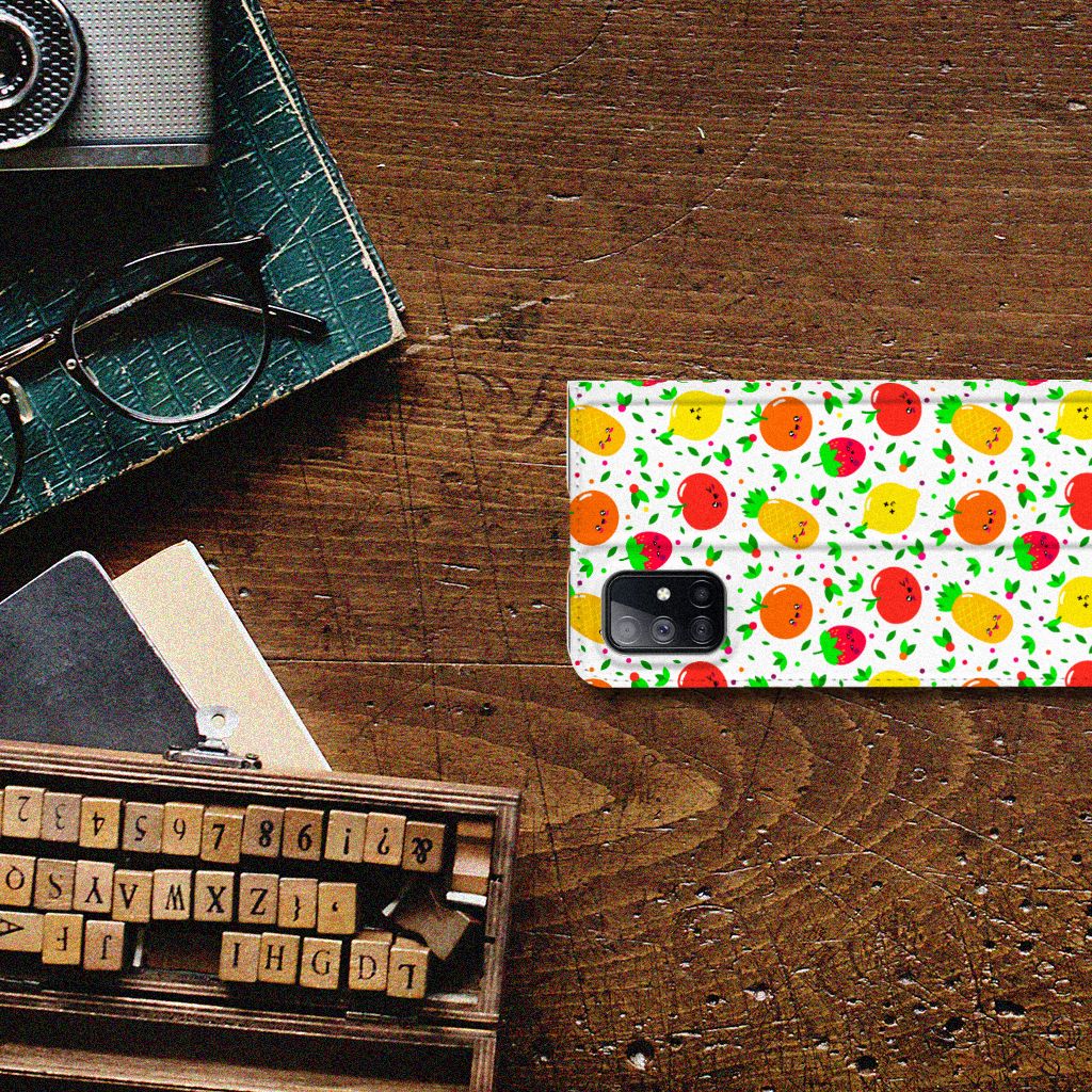 Een fris, fruitig en vrolijk hoesje, deze case met afbeeldingen van aardbeien, ananassen, appels, sinaasappels en citroenen. Minstens twee stuks fruit per dag wordt aanbevolen als dagelijkse hoeveelheid voor de mens. Dit verkleint de kans op allerlei ziekten. Dus met het aantal stukken fruit op de Samsung Galaxy M51 Flip Style Cover zou je wel een maandje zoet moeten zijn. Met het hoesje zelf kun je je hele leven doen, dit is namelijk niet stuk te krijgen. Dit komt door het sterke en flexibele materiaal waarvan het gemaakt is. De vrolijk stemmende case het desing Fruits maakt jouw telefoon dus zeer duurzaam. Zorg ervoor dat jouw smartphone gezond blijft en kies voor dit hoesje met frivool fruit. Een stand case met fruit beschermt jouw telefoon aan alle kanten en beschikt over een 1 opbergvakje en een speciale standaard. Het hoesje met fruit wordt afgesloten met een magneet aan de binnenzijde. De houder aan de binnenzijde is van TPU.