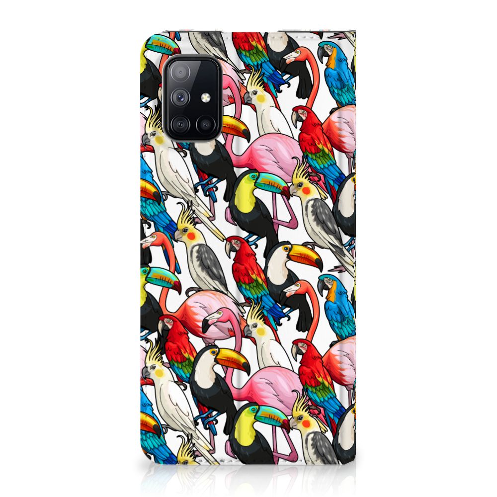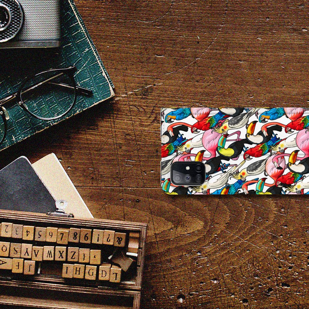 Dit exotische hoesje vol prachtige vogels is een genot voor het oog. Dankzij de felgekleurde toekans, papegaaien, flamingo’s en kaketoes op dit design word je meteen vrolijk als je naar dit hoesje kijkt. Je waant je meteen in de tropen met dit bonte gezelschap tegen een witte achtergrond. Het ontwerp staat op een Hoesje maken voor de Samsung Galaxy M51. Dit populaire smartphonehoesje met het beton-design heeft één vakje voor een pasje of briefgeld en is aan alle zijden bedrukt. Met de standcase zet je je telefoon gemakkelijk neer, zodat je je handen vrij hebt als je bijvoorbeeld een video wilt kijken. De binnenkant van de standcase is van grijs PU-leer. Dat is fijn, omdat je daardoor niet snel vlekken ziet op je hoesje.