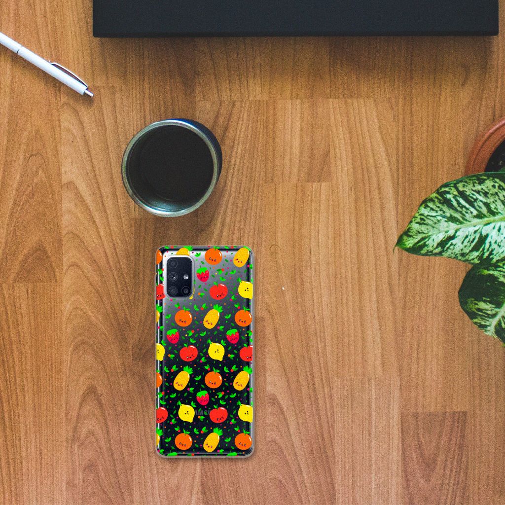 Een fris, fruitig en vrolijk hoesje, deze case met afbeeldingen van aardbeien, ananassen, appels, sinaasappels en citroenen. Minstens twee stuks fruit per dag wordt aanbevolen als dagelijkse hoeveelheid voor de mens. Dit verkleint de kans op allerlei ziekten. Dus met het aantal stukken fruit op de Samsung Galaxy M51 Siliconen Case zou je wel een maandje zoet moeten zijn. Met het hoesje zelf kun je je hele leven doen, dit is namelijk niet stuk te krijgen. Dit komt door het sterke en flexibele materiaal waarvan het gemaakt is. De vrolijk stemmende case het desing Fruits maakt jouw telefoon dus zeer duurzaam. Zorg ervoor dat jouw smartphone gezond blijft en kies voor dit hoesje met frivool fruit. Een tpu case met fruit wordt alleen aan de bovenkant bedrukt en is zeer flexibel. De randen van het hoesje blijven transparant en worden niet bedrukt met het fruit.