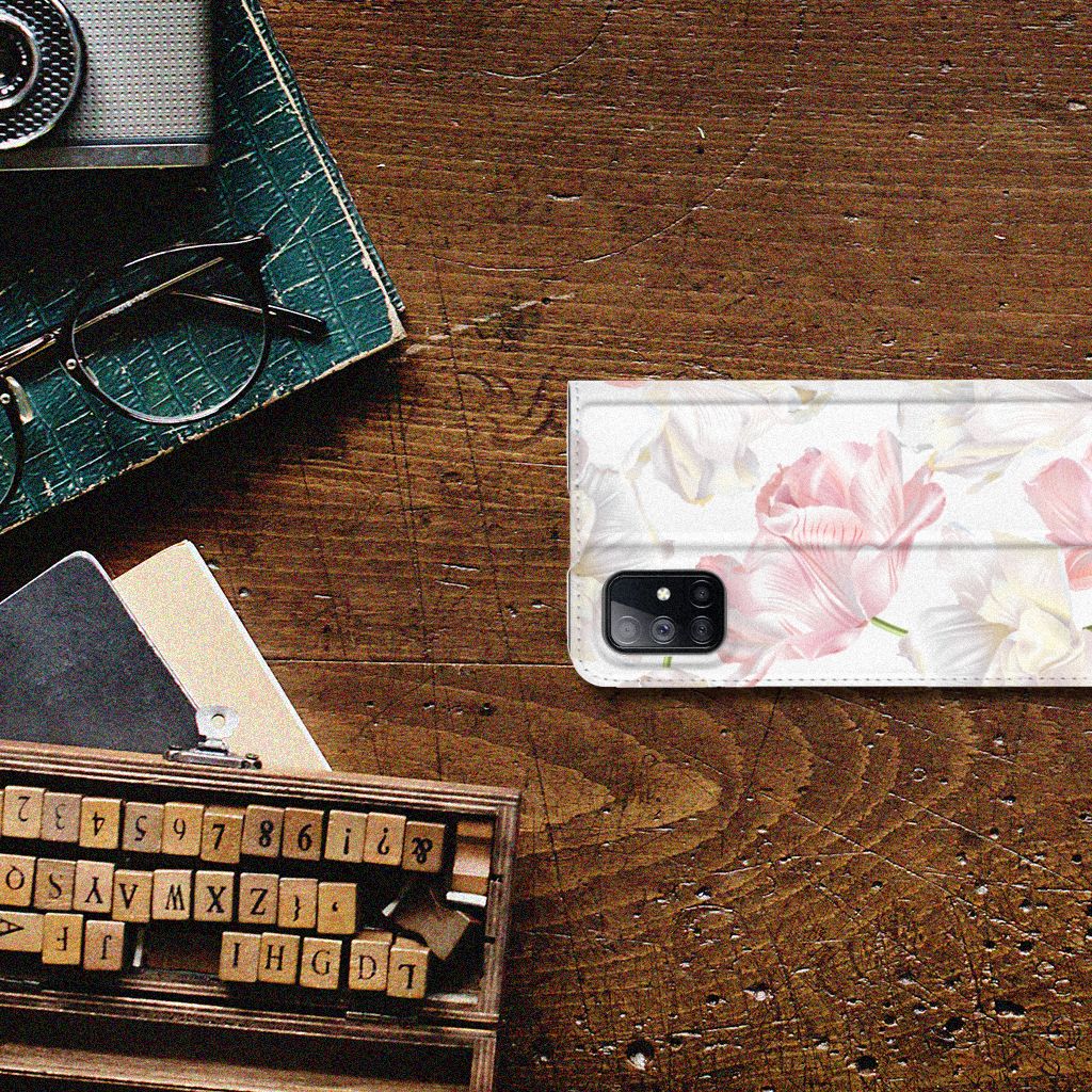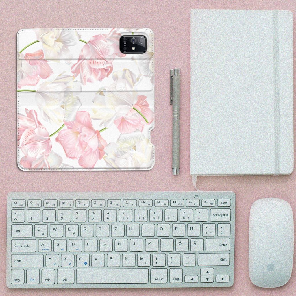 Een bosje bloemen doet een mens (en zijn smartphone) goed. De witte en roze bloemen op dit Samsung Galaxy M51 Smart Cover geven jouw smartphone een zeer mooie uitstraling. Je wordt er ook meteen een stuk rustiger van als je aan het appen of aan het bellen bent. Valt dan je telefoon op de grond, dan zal er dankzij de stand case met het design Lovely Flowers ontstaan. Onze stand cases met roze en witte bloemen zien er zeer prettig uit en zijn heel praktisch, wat blijkt uit onder meer het vakje aan de binnenkant en de handige standaard waarmee je de smartphone rechtop op tafel neer kunt zetten. De roze en witte bloemen passen goed op alle zijden van de case. Op deze stand case van leer en TPU (houder aan de binnenkant) kun je trouwens ook je eigen bloemige ontwerp zetten. In een paar simpele stappen maak je zelf een stand hoesje met daarop jouw mooiste bloemen.