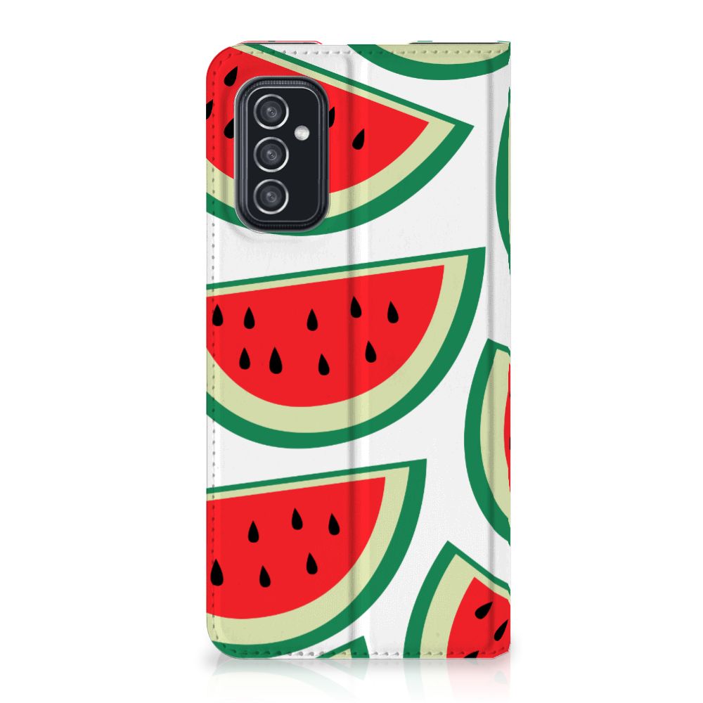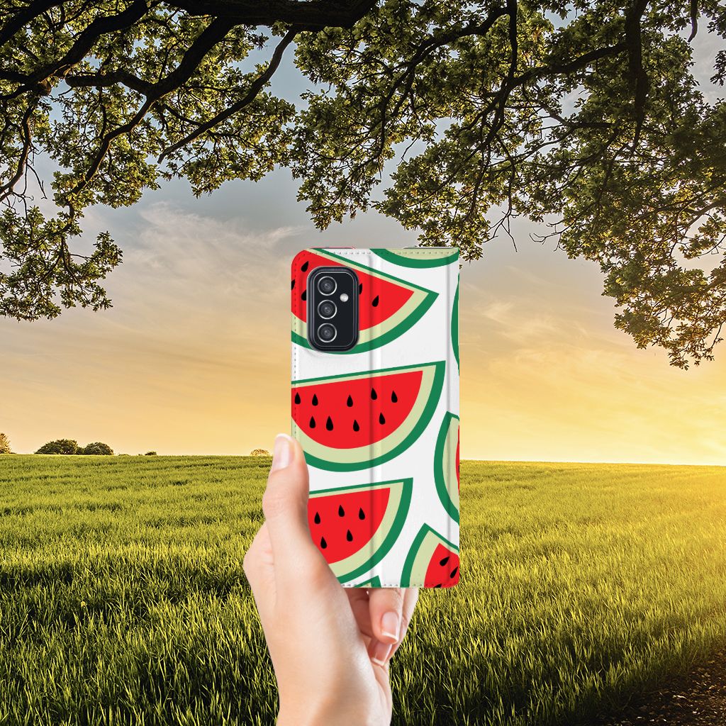 Watermeloenen zijn uitstekende dorstlessers, misschien dat je daarom juist in de zomermaanden extra enthousiast raakt van dit design hoesje Watermelons. Jij blijft gezond als je zo nu en dan een watermeloen neemt, jouw smartphone blijft in tact als je er deze Samsung Galaxy M52 Flip Style Cover omheen doet. De stand case beschermt jouw telefoon aan alle kanten en beschikt over een 1 opbergvakje en een speciale standaard. Het hoesje wordt afgesloten met een magneet aan de binnenzijde. De houder aan de binnenzijde is van TPU. Je kunt ook kiezen voor andere soorten fruit op je hoesje. Kijk maar eens naar onze andere design hoesjes op onze website.