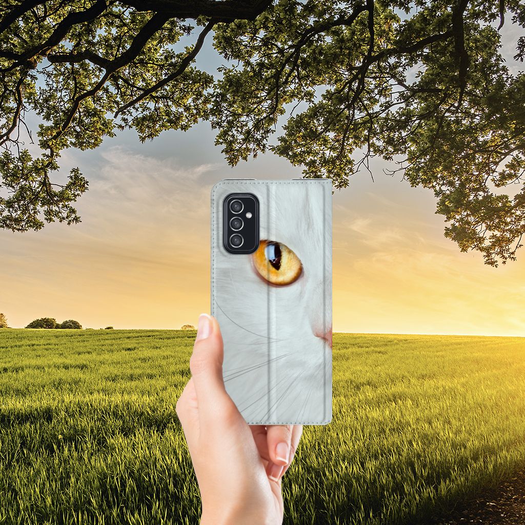 Witte katten zijn natuurlijk extra speciaal, vandaar we een exemplaar op een design hoesje hebben gezet. Een witte kat schijnt trouwens ook slechter te kunnen horen dan katten met een andere kleur. Deze witte kat staat op een zeer prominente wijze op een stand case. Deze stand case met witte kat ziet er geweldig uit en is voorzien van verschillende uitsparingen en een speciale standaard. Een Samsung Galaxy M52 Hoesje maken met witte kat beschermt jouw smartphone perfect. Alle zijden van de case zijn bedrukt. Jouw smartphone wordt erg duurzaam met dit design hoesje. Het TPU aan de binnenzijde is zeer flexibel en het pu-leer oogt chique. Verder heeft de case een houder voor bijvoorbeeld je rijbewijs aan de binnenkant.