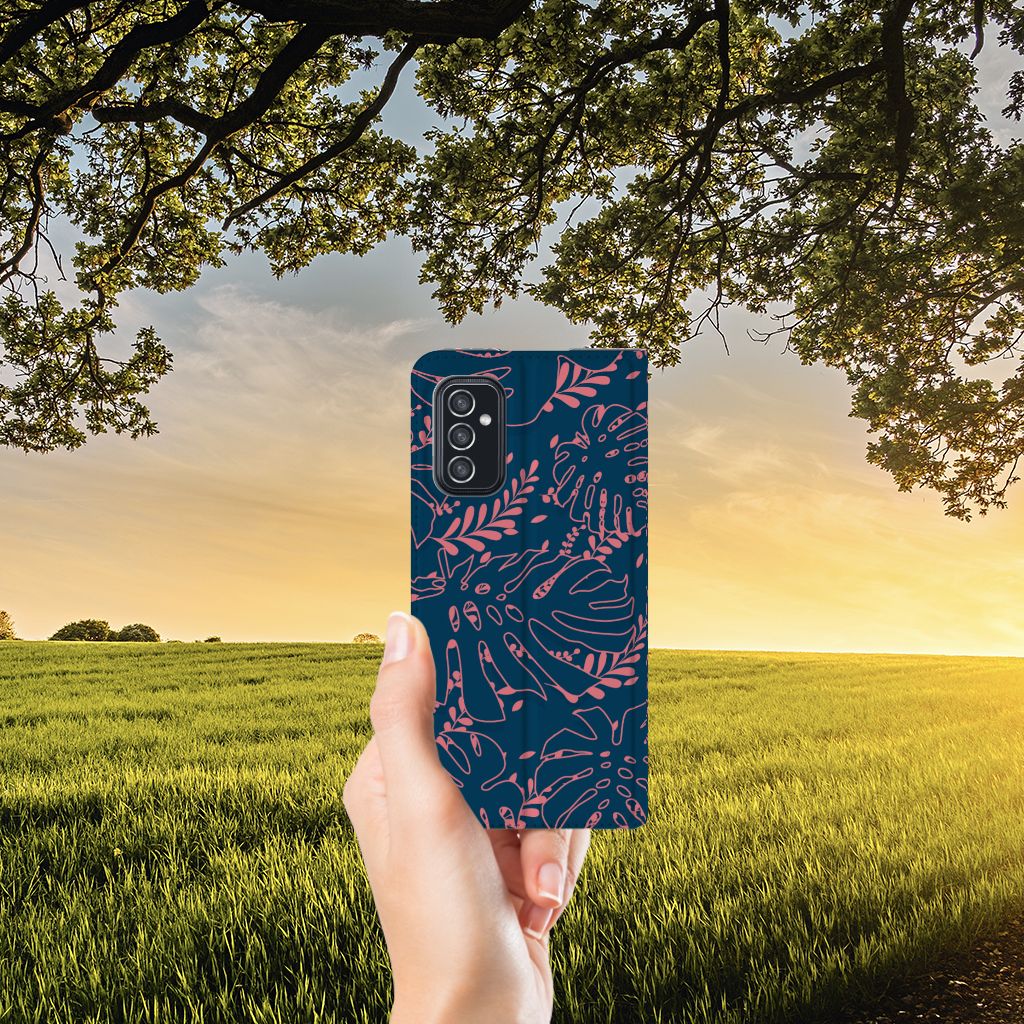 Je voelt je verbonden met de natuur als je kiest voor deze Samsung Galaxy M52 Smart Cover met print van roze bladeren op een blauwe achtergrond. De print bestaat uit verschillende roze bladeren en dit zorgt voor een fraai decoratief geheel. Met dit patroon van roze bladeren op een blauwe achtergrond creëer je een opvallende uitstraling voor jouw smartphone. Jij doet er verstandig aan om je telefoon te beschermen met dit design hoesje met roze bladeren op een blauwe achtergrond, die staan op een stand case. Dit hoesje kenmerkt zich onder meer door het handige vakje aan de binnenzijde en de magnetische sluiting aan de binnenzijde. Voel jij jezelf happy bij een beeld van roze bladeren op een blauwe achtergrond, dan is deze stand case met print een uitstekende optie. Het beschermt jouw telefoon aan alle zijden. Het TPU aan de binnenzijde klemt zich perfect om jouw smartphone.