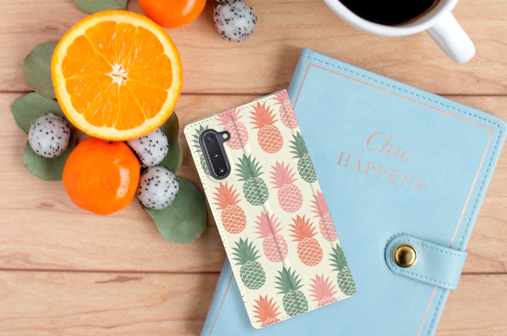 Ananas is een woord uit het Tupi, de taal van de Tupi-indianen, en betekent uitmuntende vrucht. Dit fruit van zeer hoge kwaliteit staat op onze superieure boekhoesjes, stand cases, hard cases en TPU cases. Jij blijft er gezond uitzien als je zo nu en dan een hap neemt van een Ananas , jouw smartphone blijft tip top in orde als je er een leuk telefoonhoesje omheen doet. Een ananas heeft stevig, veerkrachtig vruchtvlees. Een beetje te vergelijken met het TPU in onze hoesjes. TPU is elastisch materiaal, dat zeer buigzaam is. Vandaar dat het zeer schokbestendig is. Het ananas design staat op een stand case. Deze Samsung Galaxy Note 10 Flip Style Cover beschermt jouw telefoon aan alle kanten en beschikt over een 1 opbergvakje en een speciale standaard. Het hoesje wordt afgesloten met een magneet aan de binnenzijde. De houder aan de binnenzijde is van TPU.