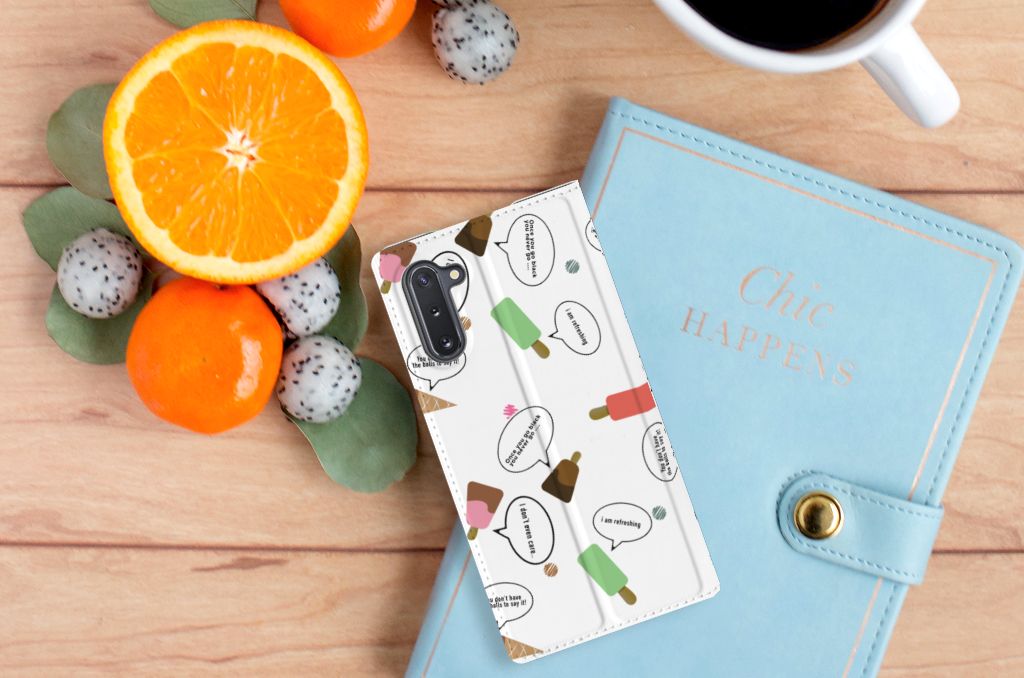 Van deze vrolijke Samsung Galaxy Note 10 Flip Style Cover met daarop verschillende soorten ijsjes met tekstwolkjes krijg je sowieso een vrij en zomers gevoel. De zomer komt naar je toe met deze print van ijsjes met tekstwolkjes. Ben je op het strand, dan ontbreekt een lekker ijsje natuurlijk niet. Net zoals je je smartphone bij de hand hebt, met daaromheen een design hoesje met bijzondere ijsjes en tekstwolkjes. Jouw telefoon kan dan de bescherming in de vorm van een stand case met ijsjes zeer goed gebruiken. Alle zijden van dit hoesje worden bedrukt met ijsjes en dankzij de speciale standaard is het erg prettig om filmpjes te bekijken. De case wordt aan de binnenzijde met een magneet afgesloten en de houder aan de binnenzijde is van TPU. Onder alle weersomstandigheden zal deze case met 1 opbergvakje en ijsjes perfect functioneren, ook op het strand met een ijsje in je hand.