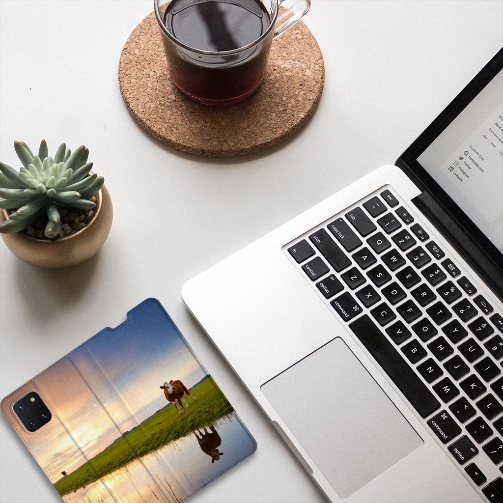 Het levert een idyllisch plaatje op, dit hoesje met een koe en ondergaande zon op de achtergrond. Door een koe buiten te laten lopen en grazen, hebben ze minder kans om ziek te worden. De Koe graast het liefst met soortgenoten, al zijn deze een stukje van de koe op de case verwijderd. Dit levert ook een mooi plaatje op, zoals je kunt zien op dit design hoesje. Deze stand case ziet er strak uit en is voorzien van verschillende uitsparingen. Een Samsung Galaxy Note 10 Lite Hoesje maken met magneet aan de binnenzijde beschermt jouw smartphone overal. Alle zijden zijn bedrukt. Koeien hebben lange graasperioden nodig, afgewisseld door rust- en herkauwperioden. Zo goed als grazen voelt voor koeien, zo lang zal jouw design hoesje meegaan. De binnenkant van de stand case is van TPU, de buitenzijde van leer.
