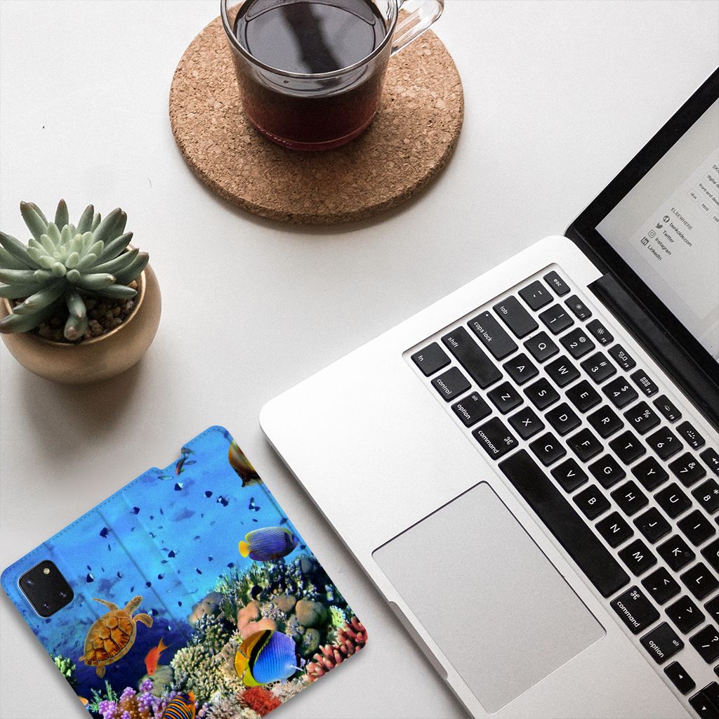 Dit kleurrijke hoesje met tropische Vissen is een ware eyecatcher. Als je aan het duiken bent en je treft een school aan met dit soort opvallende vissen, dan heb je een geweldige ervaring. Maar je hoeft er eigenlijk niet per se het water voor in te duiken. Want wij hebben een schitterende verzameling vissen op dit design hoesje gezet. Met onze zeer geavanceerde printer zetten we de afbeelding van vissen op alle zijden van de Samsung Galaxy Note 10 Lite Hoesje maken. De case heeft aan de binnenkant een vakje waarin je jouw creditcard of ander pasje kwijt kunt. Ga je een dagje vissen, dan hoef je de portemonnee dus ook niet op zak te hebben. Verder is je telefoon natuurlijk maximaal beschermd met deze stand case met print van tropische vissen. De houder aan de binnenzijde van het design hoesje met vissen print is van TPU.