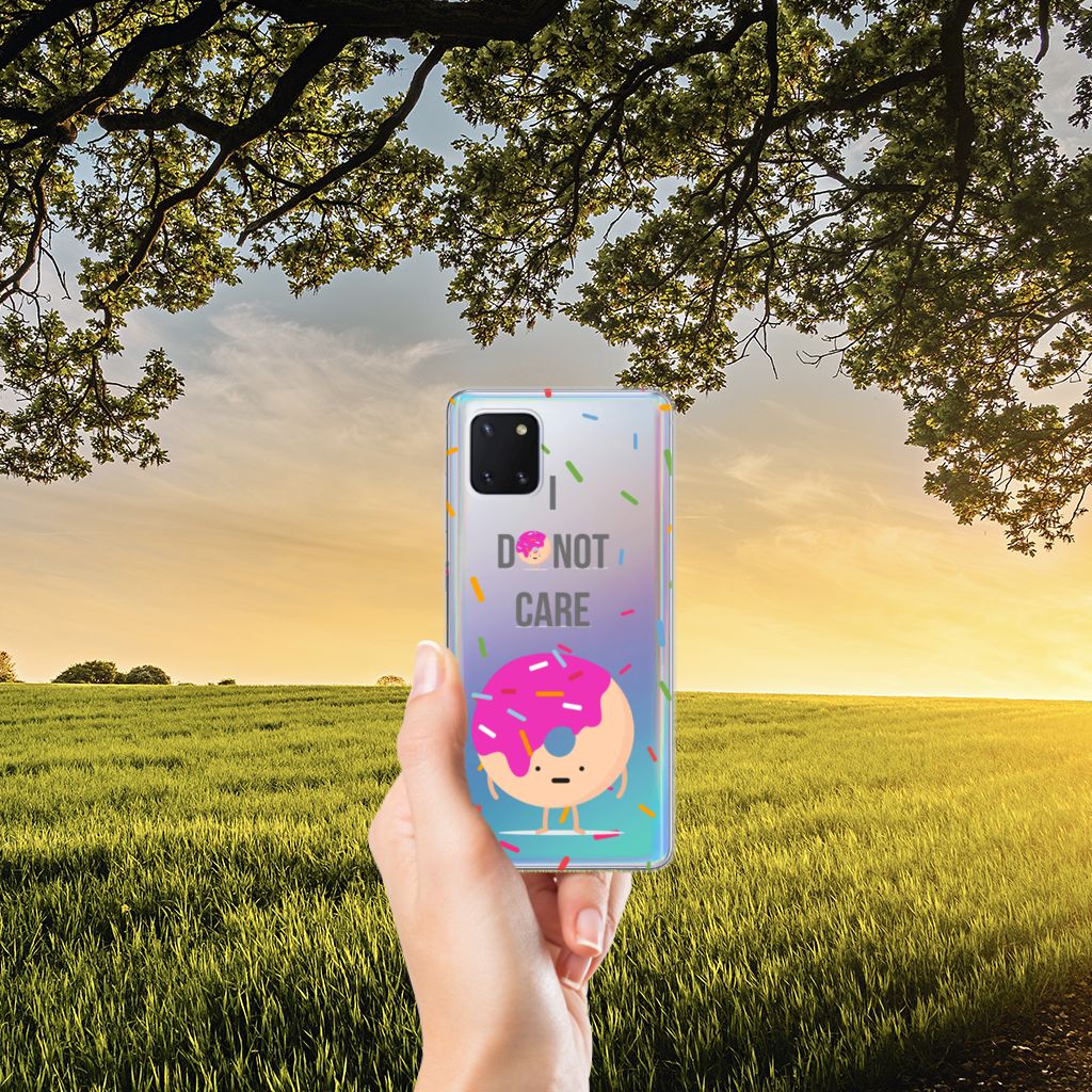 De cartoon met Donut op dit design hoesje geeft jouw smartphone een grappige en vrolijke uitstraling. De Samsung Galaxy Note 10 Lite Siliconen Case zorgt ervoor dat je je schouders op zult halen als je telefoon een keer op de grond valt. Omdat er geen schade zal optreden kun jij je weg weer heel makkelijk vervolgen. De grappige Donut Care tpu case is nergens anders te krijgen. Het design is namelijk van de hand van onze eigen ontwerper. Daarnaast zal de case jouw smartphone goed beschermen. Een Donut Care tpu case is een zeer flexibel hoesje. Dit komt onder andere door het elastische en onbreekbare materiaal. Verder is de case zeer praktisch. Wat denk je bijvoorbeeld van de opstaande randen aan de voorkant. Verder beschikt de case ook nog eens over alle noodzakelijke uitsparingen. Ook kun je zelf je eigen unieke hoesje ontwerpen, met eigen cartoons, foto’s en teksten. Een Donut Care tpu case wordt alleen aan de bovenkant bedrukt. De randen blijven volledig doorzichtig.