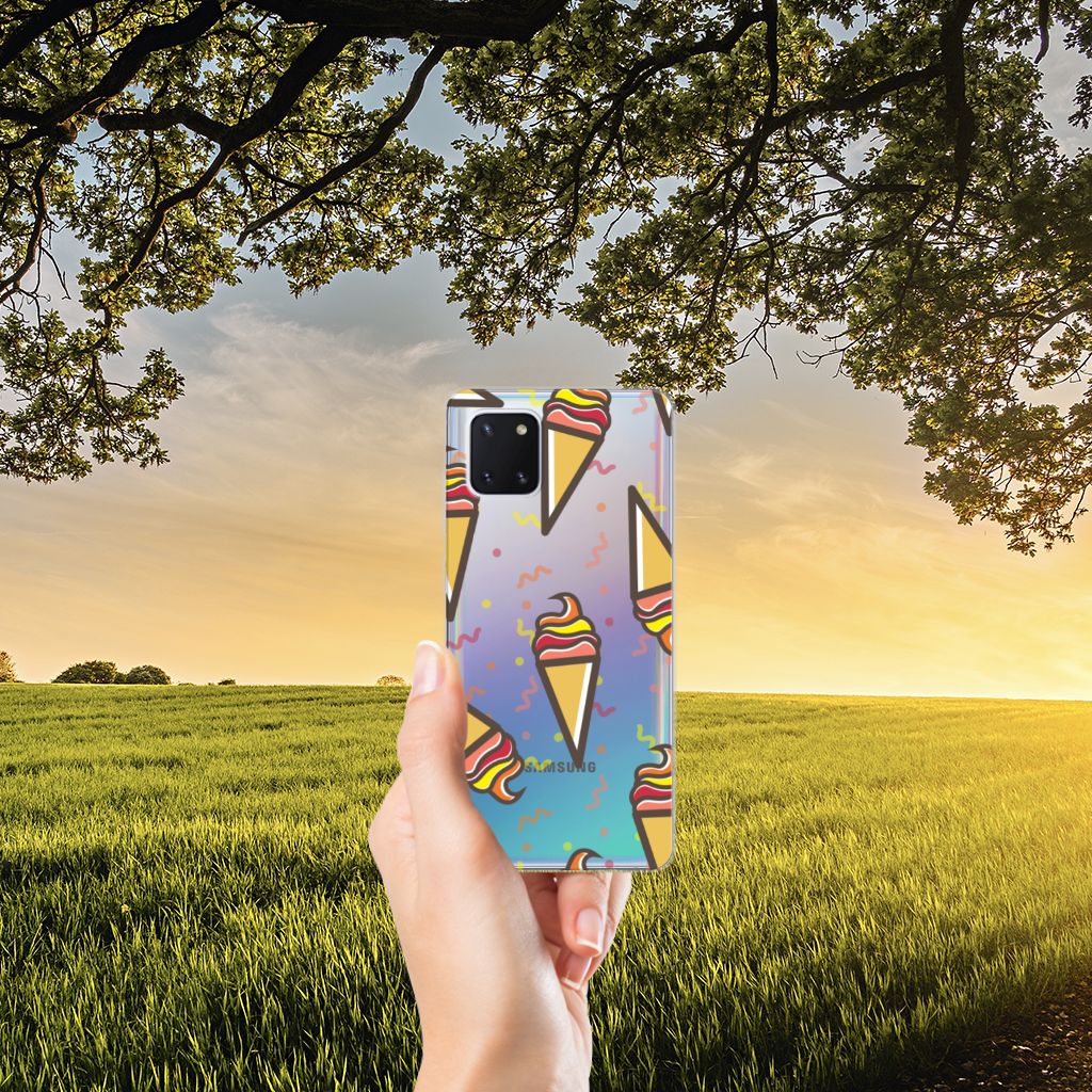 Een vrolijke Samsung Galaxy Note 10 Lite Siliconen Case met daarop verschillende ijsjes. Als je daar geen zomers gevoel meer van krijgt, weten wij het ook niet meer. De zomer en ijsjes zijn onlosmakelijk met elkaar verbonden. Tijdens een bezoekje aan het strand mag een lekker ijsje bijvoorbeeld niet ontbreken. Een design hoesje met lekkere ijsjes print past daar natuurlijk ook ontzettend goed bij. Jouw telefoon is goed beschermd met een tpu case met Icecream design. De aankoop van deze case is een heerlijke investering, die zich gegarandeerd terugbetaalt. De bovenkant van dit hoesje wordt bedrukt met ijsjes, de zijkanten blijven doorzichtig. De case is gemaakt van schokabsorberend materiaal en past altijd in je broekzak. Onder alle weersomstandigheden zal deze TPU case perfect functioneren, ook in de zomer met een ijsje in je hand. Dit smaakvolle hoesje is zeer goedkoop te bestellen en wordt zeer snel bezorgd.