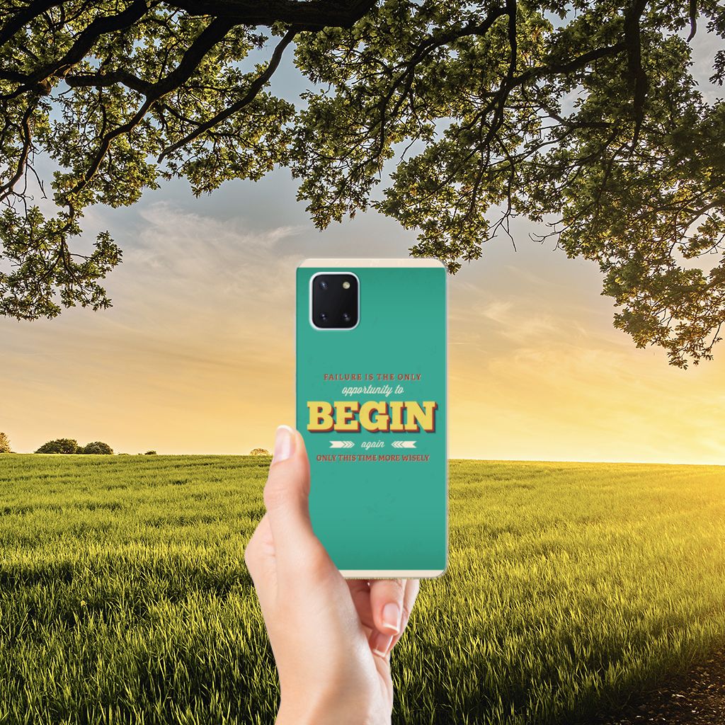 Ben je op zoek naar een uniek telefoonhoesje voor je Samsung Galaxy Note 10 Lite? Dan ben je bij B2C Telecom aan het juiste adres! Speciaal voor jou hebben we dit prachtige Quote Begin design in onze collectie hoesjes opgenomen. Het design wordt bedrukt op een Siliconen hoesje met naam en is gemaakt van flexibel rubber. Het design wordt alleen aan de bovenkant van het hoesje bedrukt en de randen blijven transparant. Aan de zijkanten zijn uitsparingen gemaakt waardoor je met gemak alle knoppen en poorten kunt bedienen. Wij adviseren om dit hoesje in combinatie met een screenprotector te gebruiken voor een langere levensduur van je telefoon. Wil je dit design hoesje nog iets extra's geven? Voeg dan gratis je naam of een quote toe! Is dit design hoesje toch niet helemaal wat je zocht? Ontwerp dan zelf een hoesje in ons ontwerpprogramma.