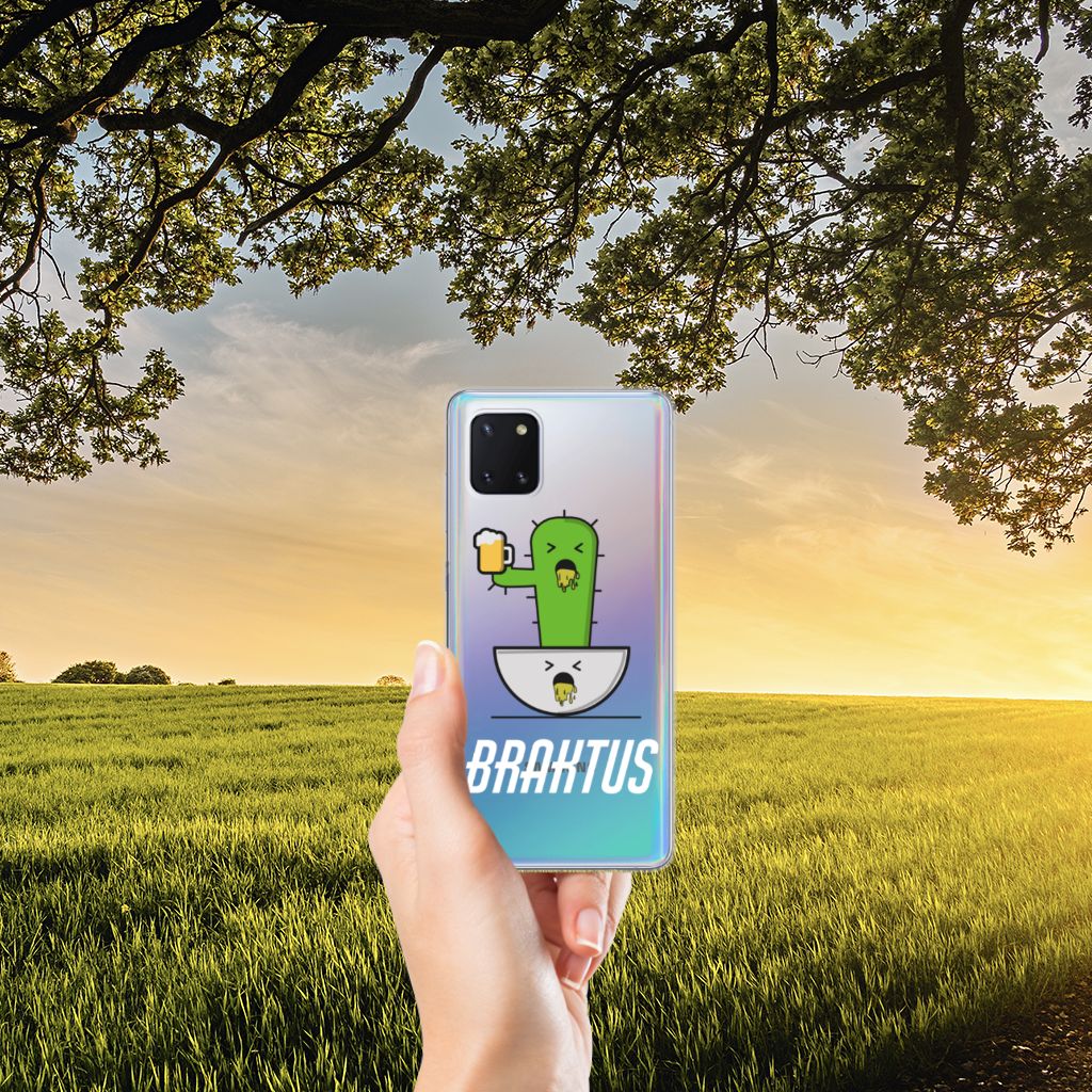 Voor de stappers onder ons hebben we dit hele grappige hoesje ontworpen. Deze Braktus case geeft perfect het gevoel weer als jij in de ochtend wakker wordt na een weekendje carnaval vieren: duf en waardeloos. Hopelijk was dit het wel waard en heb je een gezellige tijd gehad. Als aandenken zou je deze Telefoonhoesje met Naam met cactus print kunnen bestellen. Deze design case beschermt jouw Samsung Galaxy Note 10 Lite vooral aan de achterkant en zijkanten, het scherm blijft deels onbeschermd. Verder heeft het telefoonhoesje opstaande randen, zodat het toestel bij een val de grond niet direct raakt. Een handig en flexibel hoesje, dat altijd in je broekzak past. Bescherming heb je met carnaval natuurlijk wel nodig, want tijdens het hossen kan de telefoon zomaar uit je outfit vallen. Bestel daarom deze TPU case, gemaakt van schokabsorberend materiaal. Alleen de bovenkant van de case wordt bedrukt en de randen blijven transparant.