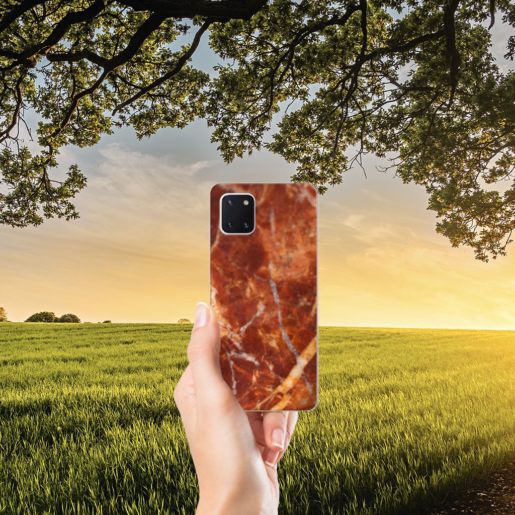 Dit design hoesje met Marmer Bruin is voor de artistieke personen onder ons. De Grieken en Romeinen wisten het al te waarderen door het als bouw- en bekledingsmateriaal toe te passen. Naast het witte Carrara marmer met haar zacht grijze geaderde belijning zijn de diverse soorten in een ruim kleurenpallet te krijgen. We hebben verschillende kleuren op design hoesjes gezet, zoals in dit geval bruin marmer. Dit is een Samsung Galaxy Note 10 Lite TPU Siliconen Hoesje met marmer in bruine kleur. Het marmer wordt bedrukt op de voorkant van een tpu case, die beschikt over opstaande randen aan de voorkant en heel goed combineert met een screenprotector. De rijkheid aan kleuren en varianties in afwerking geeft ontwerpers de vrijheid om met marmer hele mooie architectonische projecten te realiseren. Wij hebben onze designer ook veel vrijheid gegeven. Het resultaat zie je terug in deze tpu case met bruin marmer, die jouw smartphone goed beschermt. De zijkanten van de case worden niet bedrukt met marmer.