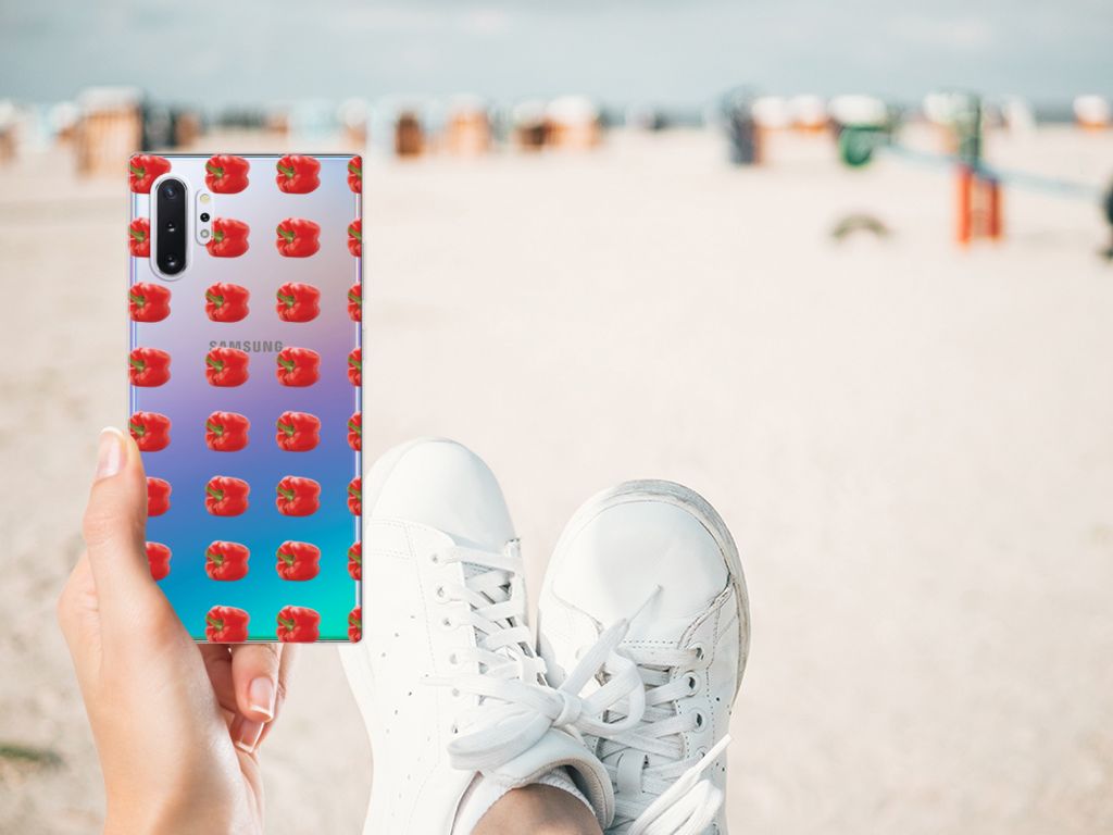 Er zit pit in jouw Samsung Galaxy Note 10 Plus Siliconen Case dankzij dit design met rode paprika’s. Paprika’s zijn er in allerlei kleuren en vormen en ze hebben gemeen dat ze heel erg gezond zijn. De rode paprika’s op deze case staan op een grijs met witte geblokte achtergrond en vormen een opvallende verschijning. Heb jij ooit iemand in je nabije omgeving rond zien lopen met een design hoesje met rode paprika’s? Waarschijnlijk niet. Dit hoesje wordt alleen aan de bovenkant bedrukt met paprika’s en is zeer flexibel. De randen van het hoesje blijven transparant en worden niet bedrukt. Met dit hoesje past jouw telefoon altijd in je broekzak. Zeker weten dat je met dit hoesje met rode paprika’s een smartphone accessoire te pakken hebt waarmee je jezelf in de schijnwerpers zet. Als je andere kleuren paprika’s op je hoesje wilt, raden we je aan ons assortiment design hoesjes te bekijken of zelf een hoesje te ontwerpen.