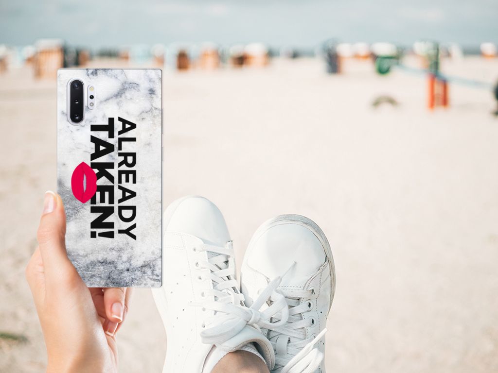 Stel dat je opdringende vrouwen of mannen van je af wil schudden op het moment dat je aan het feesten bent, omdat je al een partner hebt. Dan kun je dat met dit hoesje uitstekend duidelijk maken. Je Samsung Galaxy Note 10 Plus neem je waarschijnlijk vaak ter hand, dus dan zal de boodschap als je over dit hoesje beschikt zeker weten overkomen. Ook in het openbaar vervoer zal dit hoesje ervoor zorgen dat je minder snel versierd wordt door het andere geslacht. Als je vrijgezel bent en op zoek naar gezelschap, dan kun je beter kiezen voor een ander hoesje uit ons ruime en gevarieerde assortiment. Het design Already Taken White staat op een Siliconen hoesje met naam. Dit hoesje wordt alleen aan de bovenkant bedrukt en is zeer flexibel. De randen van het hoesje blijven transparant.