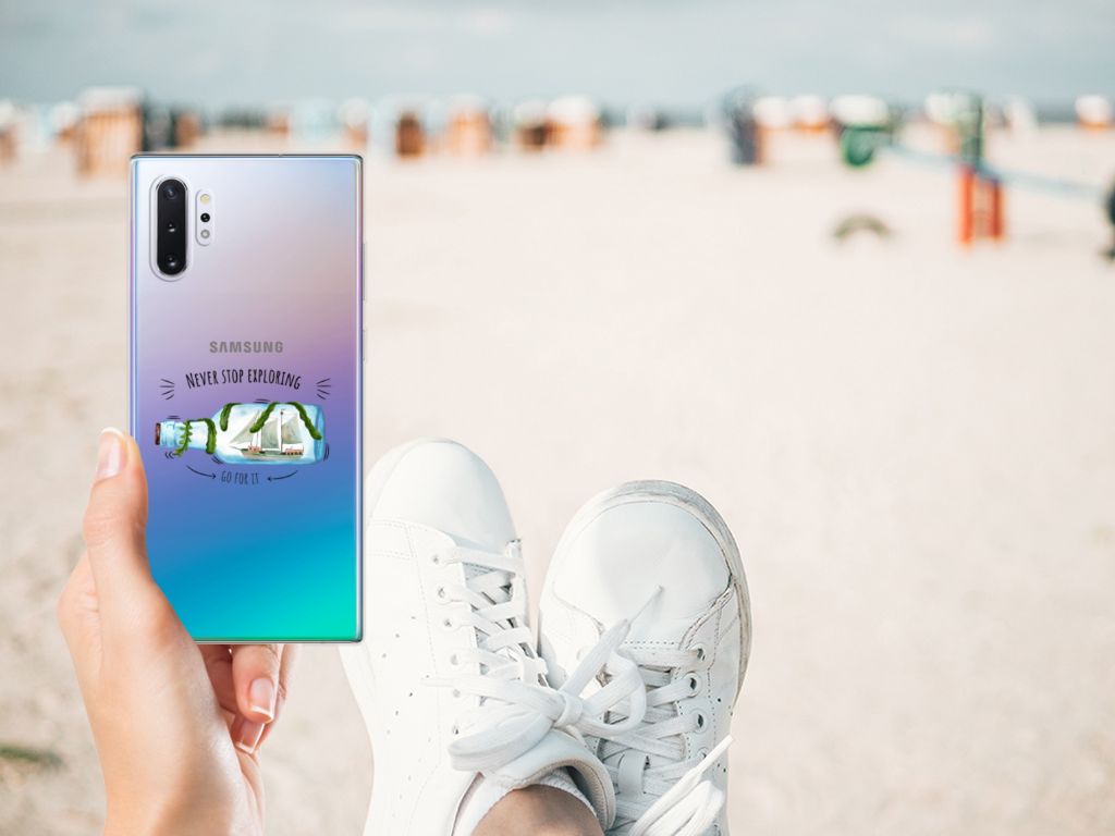 Dit leuke design met een schip in een fles is voor de echte avonturier of reiziger. Dankzij de tekst ‘Never stop exploring: Go for it’ word je altijd herinnerd aan het feit dat het volgende avontuur weer op de loer ligt! Dit design staat op een Telefoonhoesje met Naam voor je Samsung Galaxy Note 10 Plus. TPU is flexibel en heel erg sterk. Zo is je telefoon aan de achterkant en de randen heel goed beschermd. De case is aan de bovenkant bedrukt, de randen blijven transparant. Het TPU-hoesje is perfect te combineren met een screenprotector, zo zijn je telefoon en je beeldscherm altijd goed beschermd.