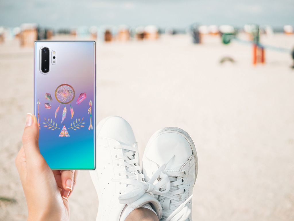 Een dromenvanger werd lang geleden al door een indianenvolk in Noord-Amerika gebruikt om nare dromen te weren. Nu nog hangen mensen over de hele wereld dromenvangers boven hun bed. Maar ook op een telefoonhoesje staat zo’n boho dreamcatcher heel mooi. Dit mooie design dat bestaat uit een tipi, pijlen en dromenvanger heeft veel verschillende prachtige kleuren. Maar omdat het ontwerp minimalistisch en klein is, is het design toch subtiel te noemen. Dit ontwerp staat op een Telefoonhoesje met Naam voor je Samsung Galaxy Note 10 Plus. TPU is flexibel en heel erg sterk. Zo is je telefoon aan de achterkant en de randen heel goed beschermd. De case is aan de bovenkant bedrukt, de randen blijven transparant. Het TPU-hoesje is perfect te combineren met een screenprotector, zo zijn je telefoon en je beeldscherm altijd goed beschermd.