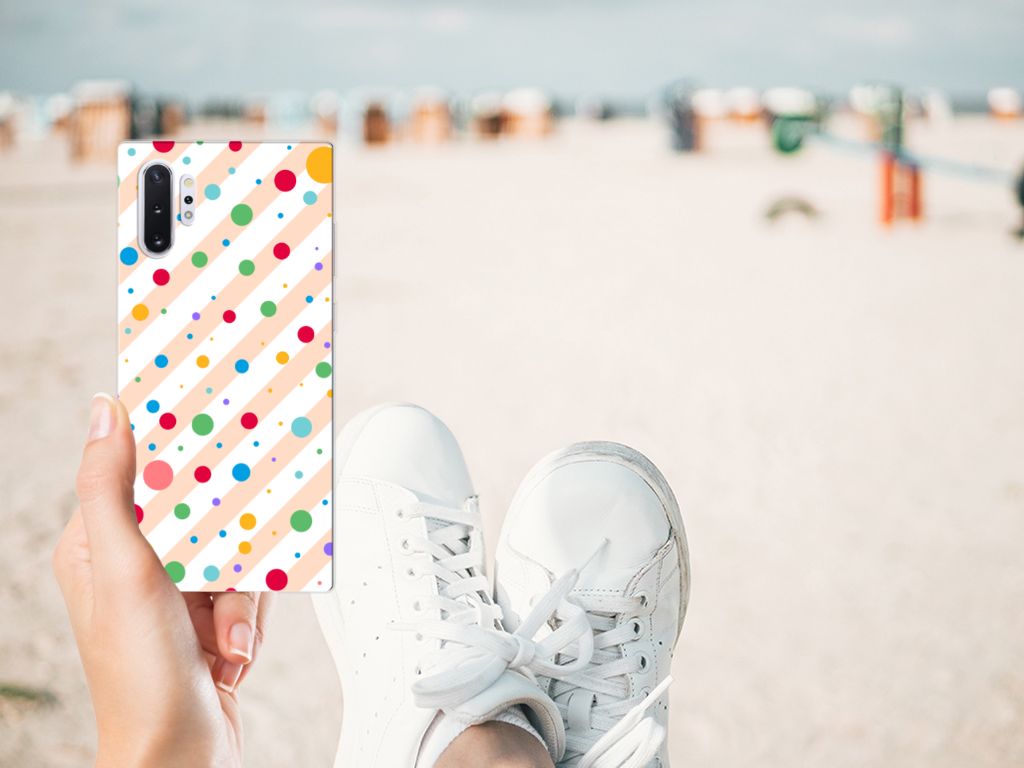 Een Samsung Galaxy Note 10 Plus TPU bumper met verschillende kleuren stippen is een schitterende bescherming van jouw smartphone. De tpu case met het design Dots in alle kleuren van de regenboog komt voor jou als geroepen. Maak je geen gebruik van dit zeer mooie hoesje, dan kan het met jouw smartphone een beetje beroerd aflopen. Deze mooie tpu case met verschillende soorten klompen in verschillende kleuren is zo’n beetje de meest flexibele case die er bestaat. Het hoesje met stippen zorgt voor een goede bescherming van je smartphone, vooral aan de achterzijde en zijkanten. Met een tpu hoesje met stippen in verschillende kleuren blijft jouw gsm volledig in tact. Heb je liever een tpu case met stippen in andere opvallende kleuren? Ontwerp dan zelf een tpu case met je eigen foto’s en teksten! De case wordt aan de achterzijde bedrukt met klompen, de zijkanten blijven doorzichtig.
