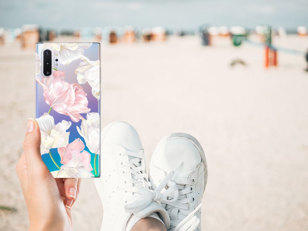 Een bosje bloemen doet een mens (en zijn smartphone) goed. De witte en roze bloemen op deze Samsung Galaxy Note 10 Plus TPU Case geven jouw smartphone een zeer mooie uitstraling. Je wordt er ook meteen een stuk rustiger van als je aan het appen of aan het bellen bent. Valt dan je telefoon op de grond, dan zal er dankzij de tpu case met het design Lovely Flowers ontstaan. Helemaal niet als je er een screenprotector bij hebt gekocht. Onze tpu cases met roze en witte bloemen zien er zeer prettig uit en zijn heel praktisch, getuige onder meer de opstaande randen en het flexibele materiaal. Alleen de achterkant van de tpu case wordt bedrukt met roze en witte bloemen. Op deze tpu case kun je trouwens ook een eigen ontwerp zetten. In een paar simpele stappen ontwerp je zelf een stand case met daarop jouw favoriete bloemen.