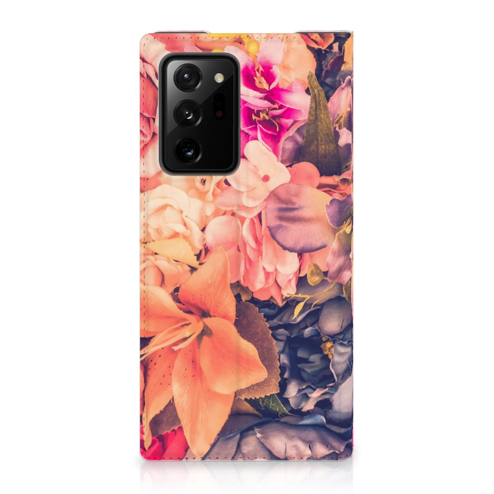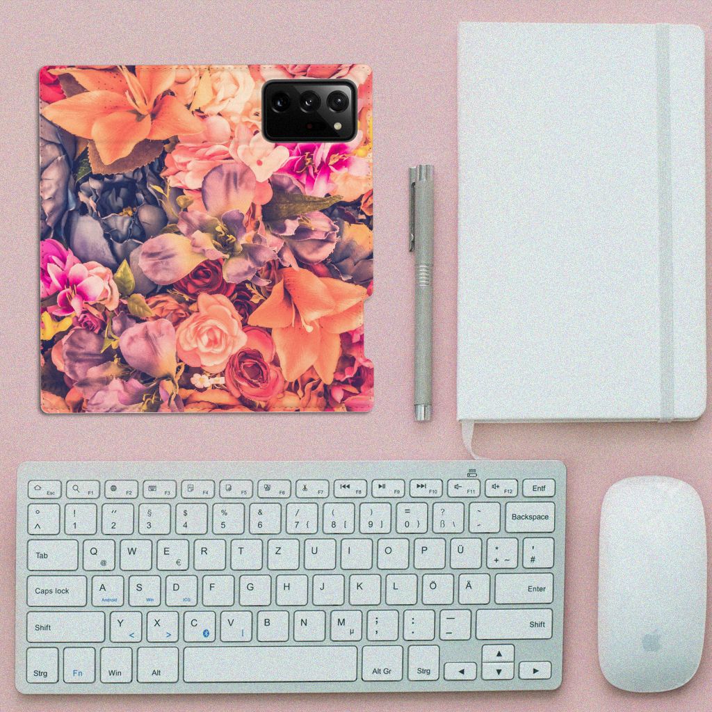 Dit Bosje Bloemen doet een mens en zijn smartphone goed. De oranje, paarse en roze bloemen op deze Samsung Galaxy Note 20 Ultra Smart Cover geven jouw smartphone een zeer sierlijke uitstraling. Je wordt er ook meteen vrolijker van als je aan het appen, mailen of aan het bellen bent. Valt dan je telefoon op de grond, dan zal er dankzij de stand case met oranje, paarse en roze bloemen geen schade ontstaan. Onze stand cases met oranje, paarse en roze bloemen bieden de allerbeste bescherming en zijn heel praktisch, wat blijkt uit onder meer het vakje aan de binnenkant en de handige standaard waarmee je de smartphone rechtop op tafel neer kunt zetten. De oranje, paarse en roze bloemen passen goed op alle zijden van de case. Op deze stand case van leer en TPU (houder aan de binnenkant) is het ook mogelijk je eigen ontwerp te zetten. In no time maak je zelf een stand case met daarop foto’s van jouw favoriete bloemen.