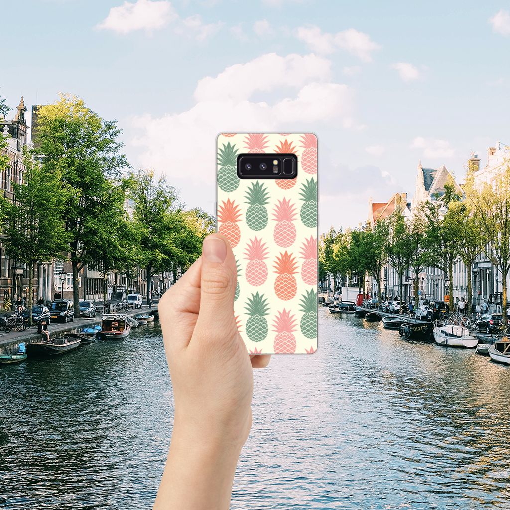Ananas is een woord uit het Tupi, de taal van de Tupi-indianen, en betekent uitmuntende vrucht. Dit fruit van zeer hoge kwaliteit staat op onze superieure boekhoesjes, stand cases, hard cases en TPU cases. Jij blijft er gezond uitzien als je zo nu en dan een hap neemt van een Ananas , jouw smartphone blijft tip top in orde als je er een leuk telefoonhoesje omheen doet. Een ananas heeft stevig, veerkrachtig vruchtvlees. Een beetje te vergelijken met het TPU in onze hoesjes. TPU is elastisch materiaal, dat zeer buigzaam is. Vandaar dat het zeer schokbestendig is. Het ananas design staat op een staat op een TPU case. Deze Samsung Galaxy Note 8 Siliconen Case wordt alleen aan de bovenkant bedrukt en is zeer flexibel. De randen van het hoesje blijven transparant.