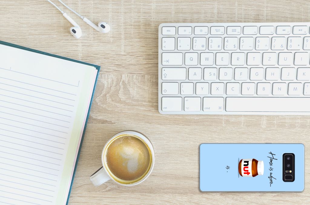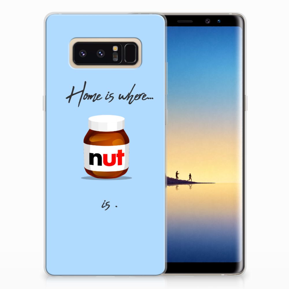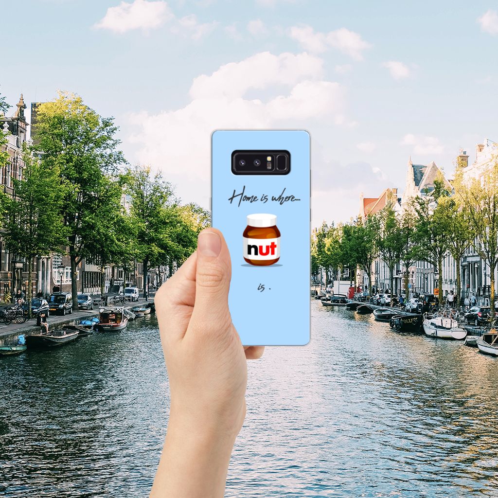 Ben je liefhebber van chocoladepasta, dan is dit het perfecte Samsung Galaxy Note 8 Siliconen Case voor jou. De chocoladepasta is enorm populair, dus is het niet zo heel gek dat je een ‘Nut Home’ tpu case in een blauwe kleur aantreft in ons assortiment design hoesjes met illustraties. Dit tpu hoesje is zeer flexibel en past altijd in je broekzak. Alleen de bovenkant van dit hoesje wordt door ons bedrukt in blauwe kleur met de pasta, op zeer duurzame manier. Mensen die houden van de bekendste pasta van het moment, kiezen voor deze blauwe tpu case. Er staan geen illustraties op de zijkanten van een tpu case. Je kunt ook een eigen tekst toevoegen aan het opvallende design.
