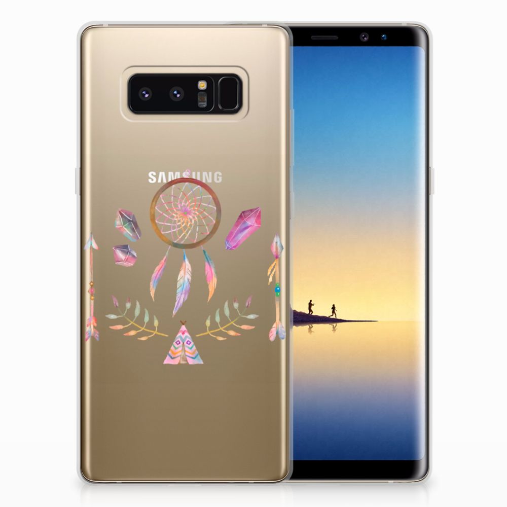 Een dromenvanger werd lang geleden al door een indianenvolk in Noord-Amerika gebruikt om nare dromen te weren. Nu nog hangen mensen over de hele wereld dromenvangers boven hun bed. Maar ook op een telefoonhoesje staat zo’n boho dreamcatcher heel mooi. Dit mooie design dat bestaat uit een tipi, pijlen en dromenvanger heeft veel verschillende prachtige kleuren. Maar omdat het ontwerp minimalistisch en klein is, is het design toch subtiel te noemen. Dit ontwerp staat op een Telefoonhoesje met Naam voor je Samsung Galaxy Note 8. TPU is flexibel en heel erg sterk. Zo is je telefoon aan de achterkant en de randen heel goed beschermd. De case is aan de bovenkant bedrukt, de randen blijven transparant. Het TPU-hoesje is perfect te combineren met een screenprotector, zo zijn je telefoon en je beeldscherm altijd goed beschermd.
